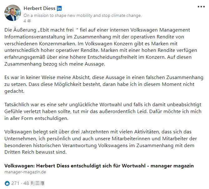 在德國媒體披露此事後,迪斯也發文道歉,他不僅直接提及福斯汽車與納粹政權的關係(該公司於1936年由「德意志勞動陣線」創立),也寫下「我無意將這句話放在錯誤的背景下」,以及「如果無意間有所冒犯,我深表歉意」這樣的句子。