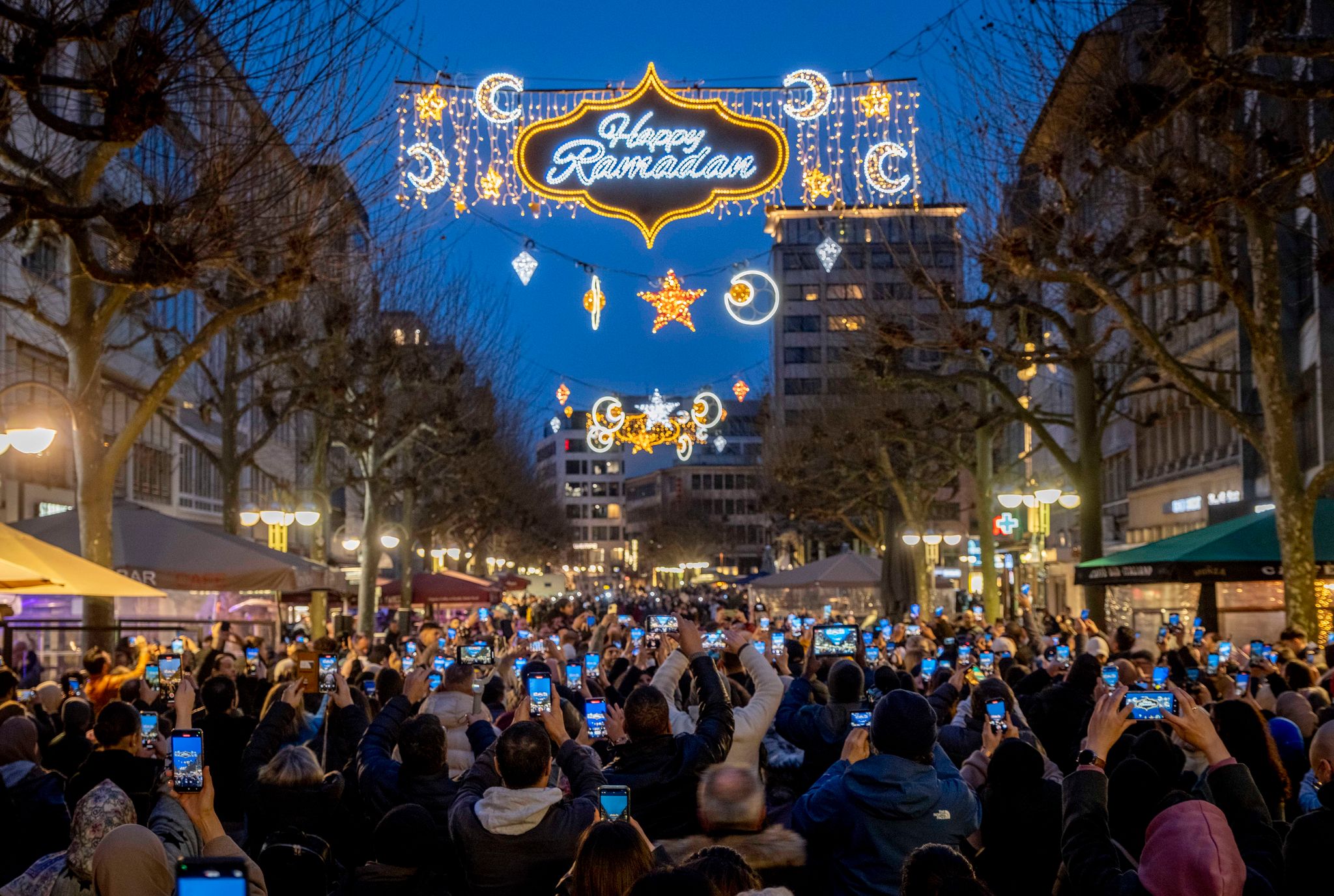 美聯社 / 達志影像null德國法蘭克福的街道上,則亮起「齋戒月快樂」的字樣。
