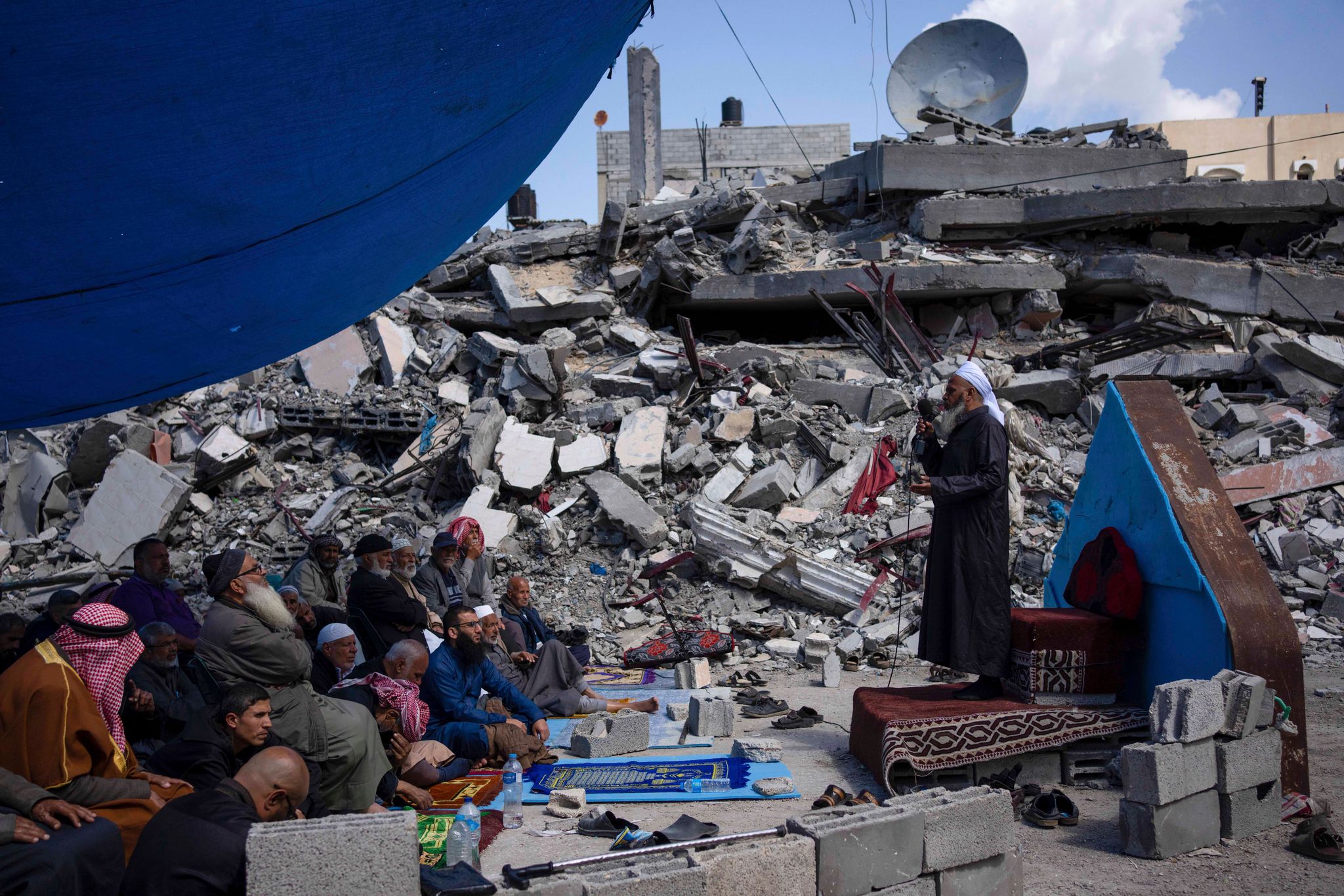 加薩地區的巴勒斯坦居民,在一座被以色列空襲摧毀的清真寺前祈禱。