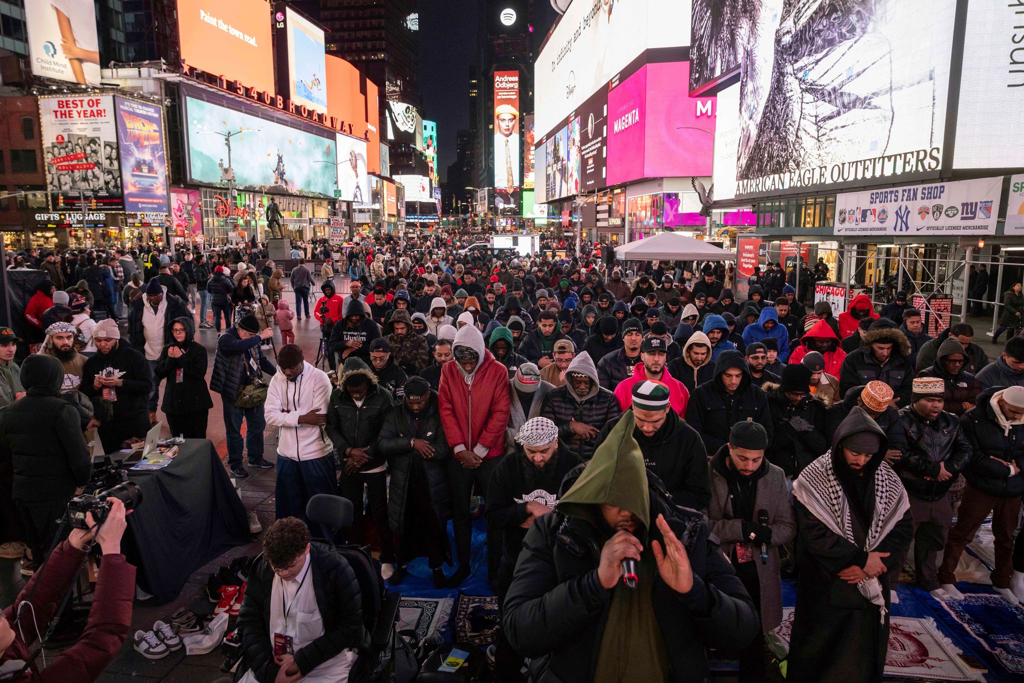 美國時代廣場上,許多穆斯林正聚集祈禱。