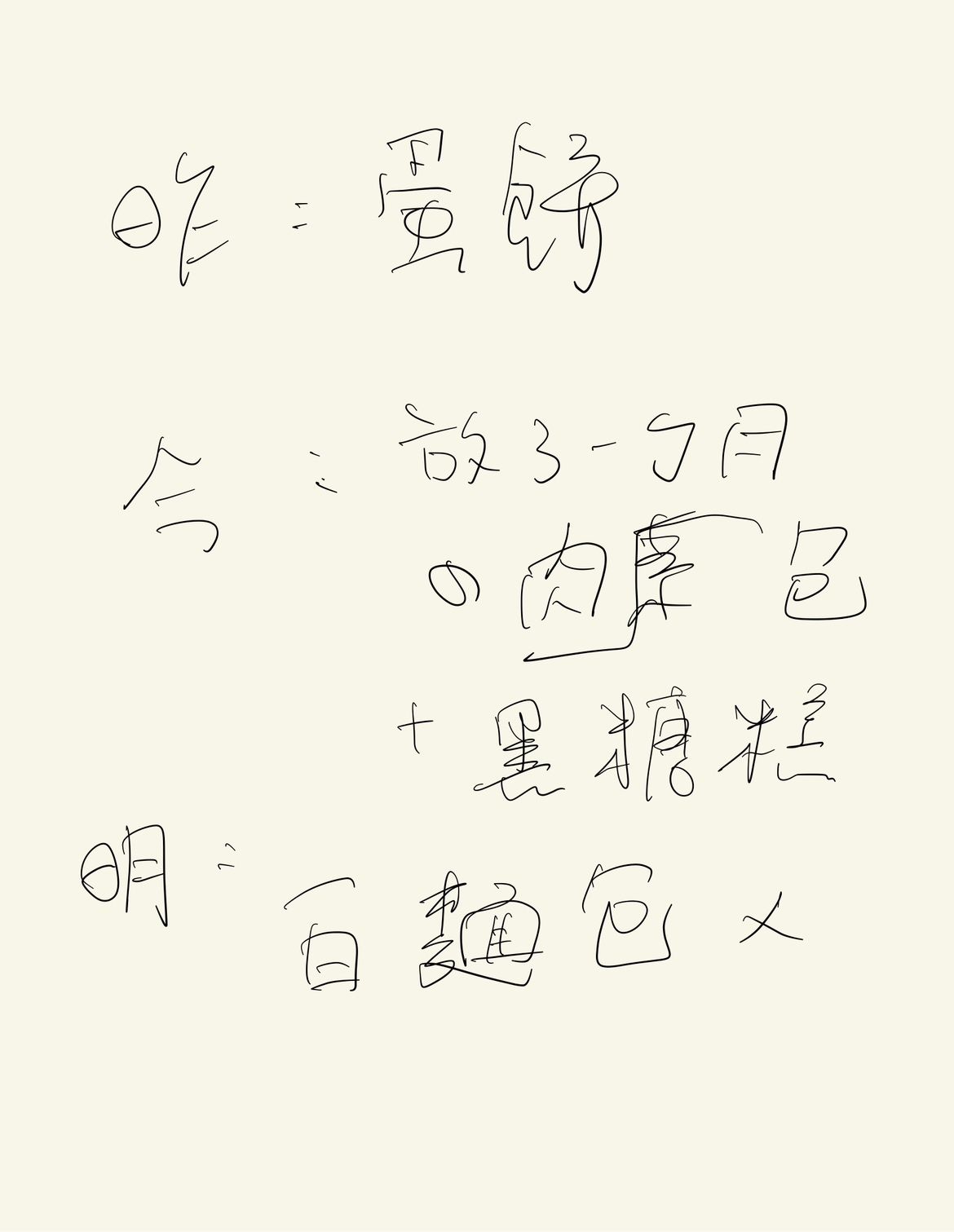 我們邀請DQ編輯寫下自己昨日、今日以及明日預計要吃的早餐。金探子書寫時序由上至下為過去、今日與未來。