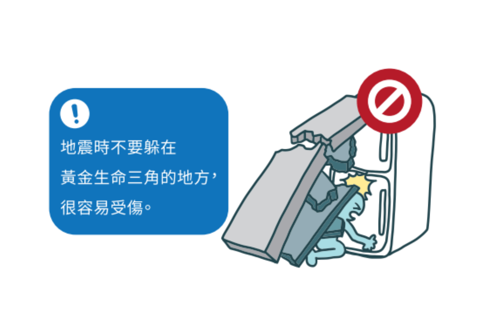 不要躲在黃金三角:再次強調,過往大家熟知的黃金三角理論,已被證實為錯誤觀念。若地震來臨時,千萬不要躲在大型傢俱旁邊,否則很可能遭到傢俱輾壓受傷。