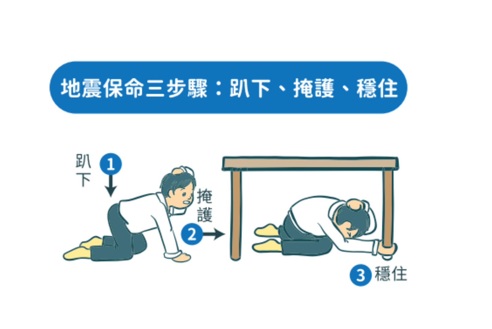穩住:一手握住桌腳,一手保護頭頸,並確保桌面能夠掩護整個身體,避免被掉落物品砸傷。
