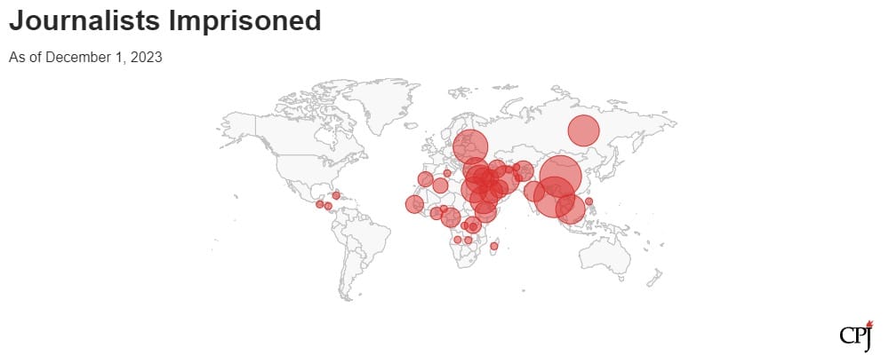 根據《費城詢問報》(The Philadelphia Inquirer)近期刊登的一篇社論指出,全球有320名記者在被關押狀態,保護記者委員會(Committee to Protect Journalists,CPJ)統計,被囚禁的記者中有三分之一來自中國(44人)、緬甸(43人)和白俄羅斯(28人)。自2023年10月加薩戰火再起,近100名記者和媒體工作者已經遇害。