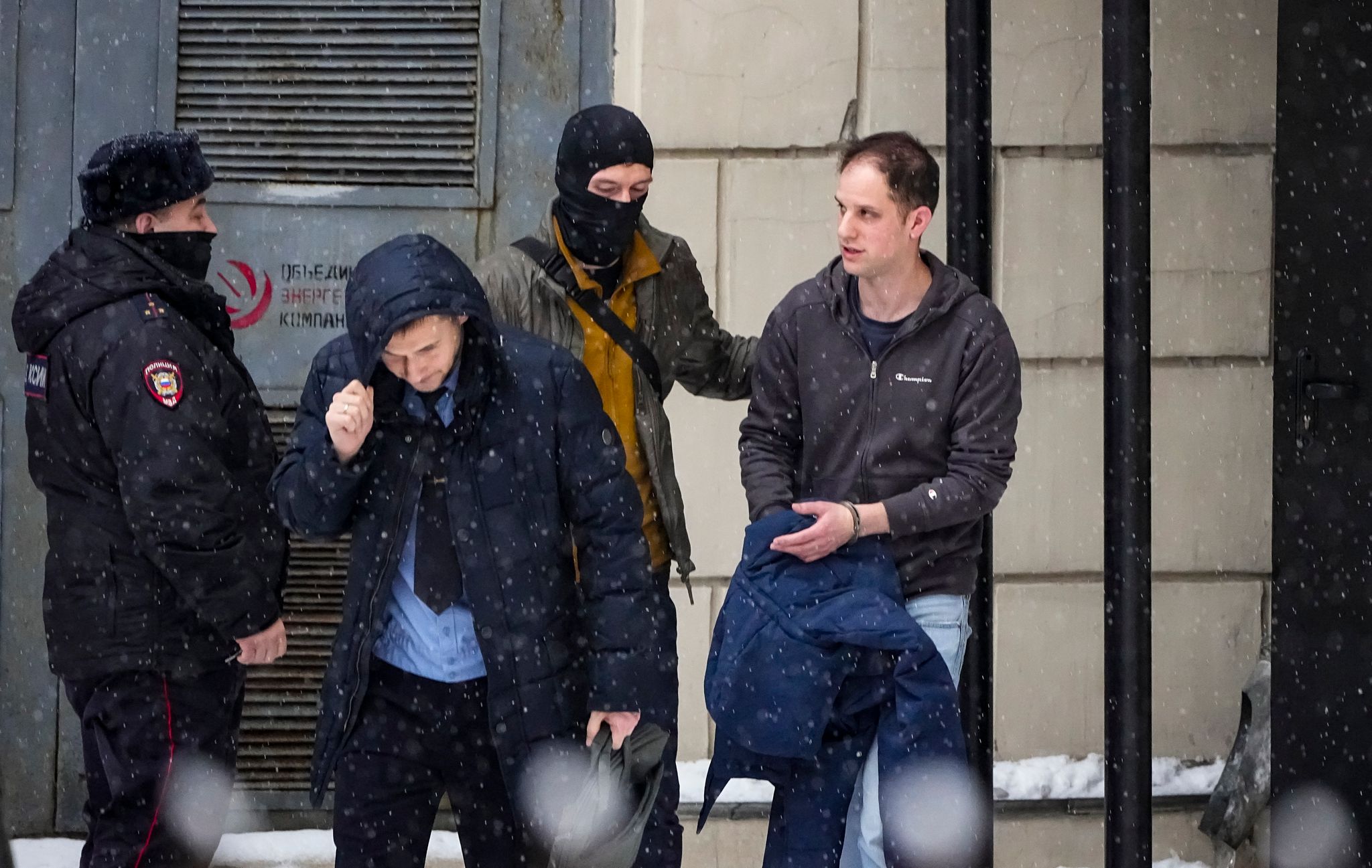 2024年1月26日,美國《華爾街日報》的記者艾文.格士科維契(Evan Gershkovich)(右)被護送離開莫斯科的法院。