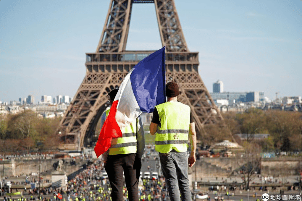 2019年3月30日,參與黃背心運動的抗議民眾高舉法國國旗,來到巴黎艾菲爾鐵塔前示威,底下可以看到穿著黃背心的示威人潮。