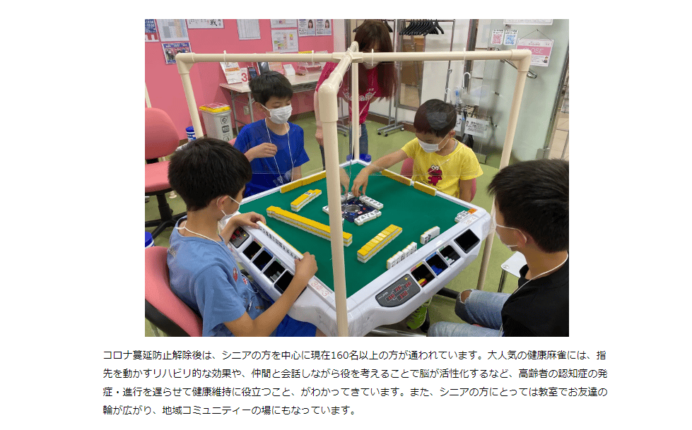 「和了!」、「啊,被吃了」的聲音此起彼落,只是這些聲音都來自孩童們稚嫩的童音。近年,日本開設越來越多面向孩童的麻將教室,只要「懂漢字且坐得住」任何年紀的孩童都可以參加,從學齡前再到國小、國中生,放學後邀約去打麻將,已經成為日本孩童的課後娛樂。