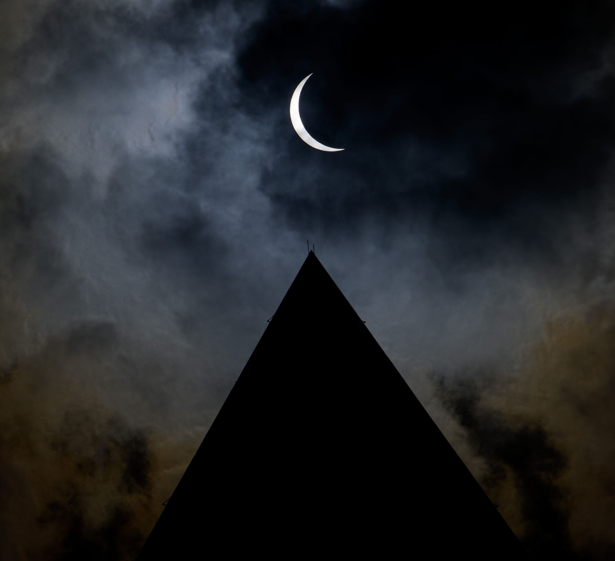 2024年4月8日,華盛頓紀念碑頂端,月球正逐漸蓋住太陽。