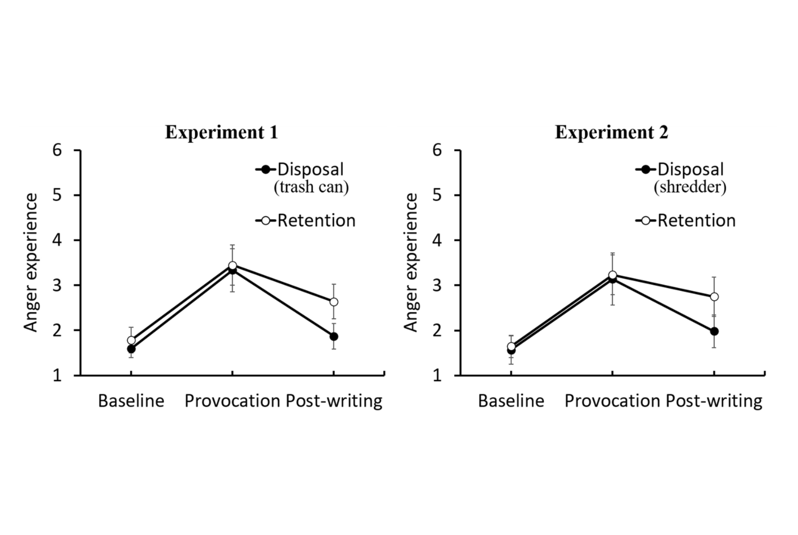 所有參與者在受到侮辱的回饋意見後,都表現出更憤怒的情緒。接著,一組參與者被告知可以將他們寫的文章扔進垃圾桶,或是保留在辦公室的文件夾中。第二組被告知用碎紙機銷毀該文件或將其放入塑膠盒中,然後觀察他們的情緒水平。