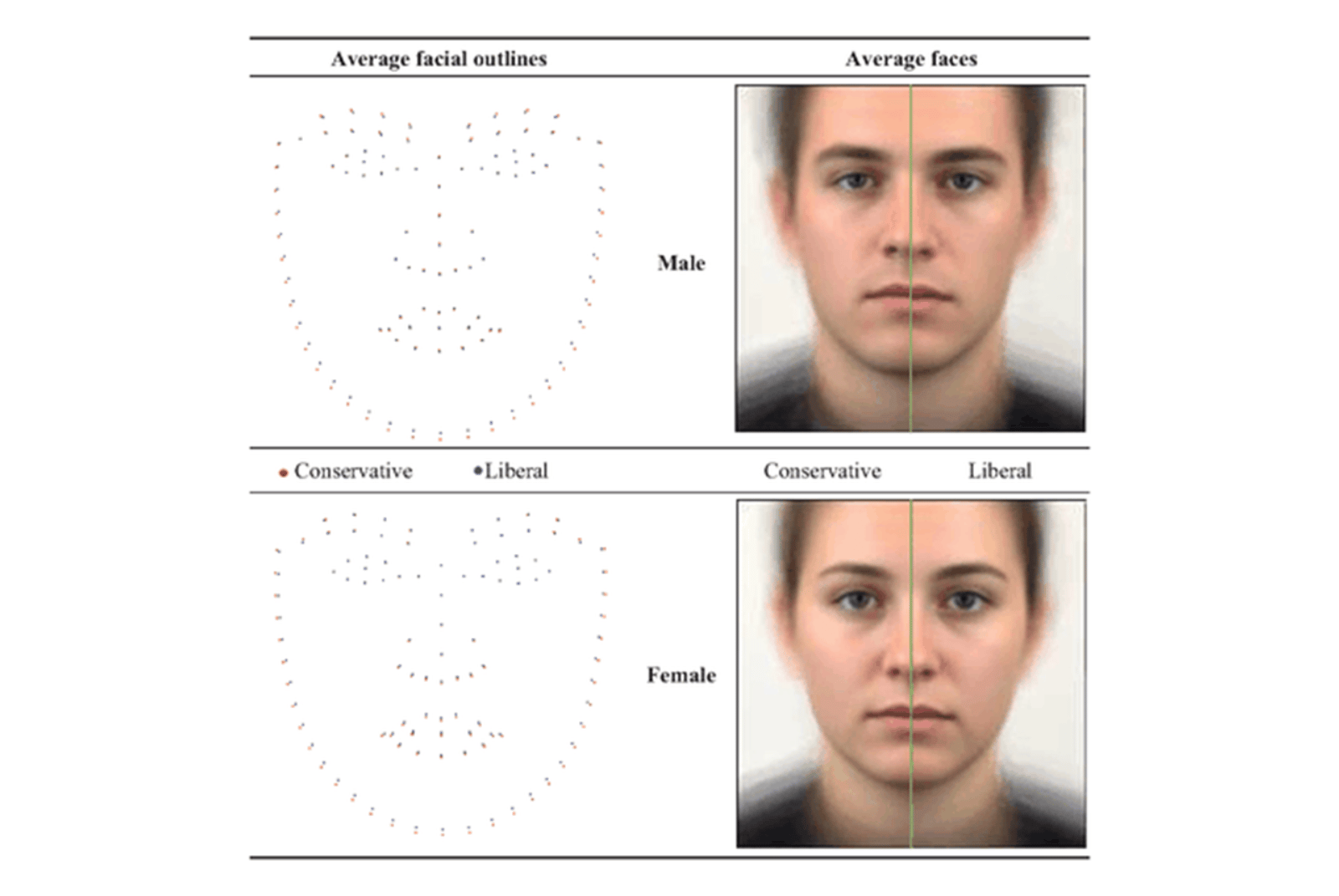 研究人員發現,美國自由主義者和保守主義者有明顯不同的臉部輪廓。自由主義者的下半臉較小,嘴唇和鼻子位置較低,下巴也比保守主義者更小。