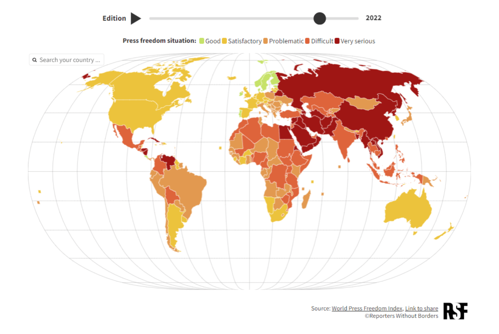 無國界記者組織指出,2024年全球有超過一半的人口都將參與投票,然而全球新聞自由的「政治指標」卻明顯下滑。全球各地區的新聞媒體遭受的壓迫,包括記者遭到拘留、獨立媒體遭壓制,或是假訊息廣泛傳播等。