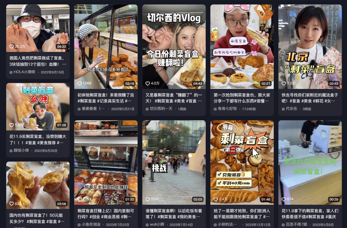 2021年中國「惜食魔法袋」引進了剩菜盲盒的概念,並逐漸推廣至多個城市,在社群媒體的推波助瀾之下,可以用原價三分之一的價格買到一餐美味的剩菜盲盒,成了中國Z世代們的省錢妙招。例如,原本原價30塊(約新台幣137元)的麵包組合,盲盒卻只要11.9元(約新台幣54元)。