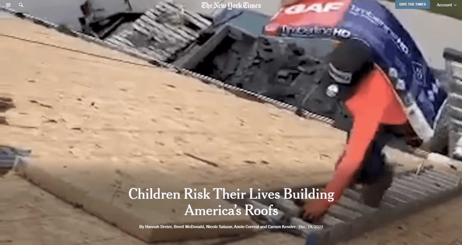 紐約時報記者漢娜製作一系列深度報導,揭示美國各地有許多移民童工,正面臨艱困的工作條件與剝削。漢娜持續追蹤、深掘此議題,還說明當地政府、企業的作為,如何導致此現象長期存在。