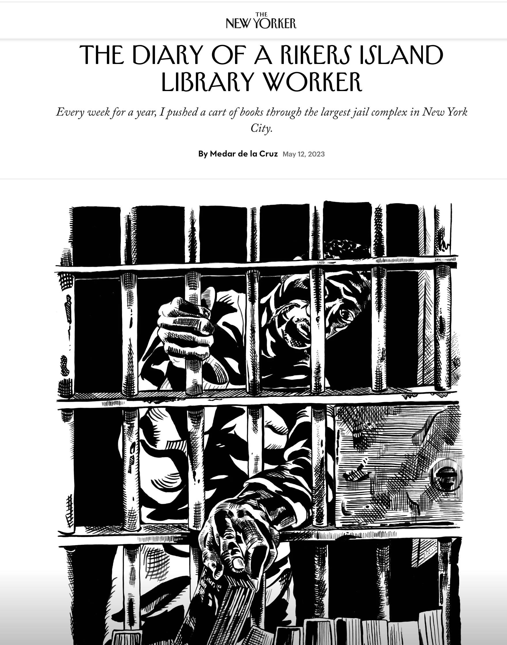《紐約客》的特約作者梅達爾,以紐約的監獄島「雷克斯島」(Rikers Island)為主題,運用多幅黑白漫畫圖像,描繪此處的囚犯、獄卒們對書籍的渴望,呈現出他們人性化的一面。