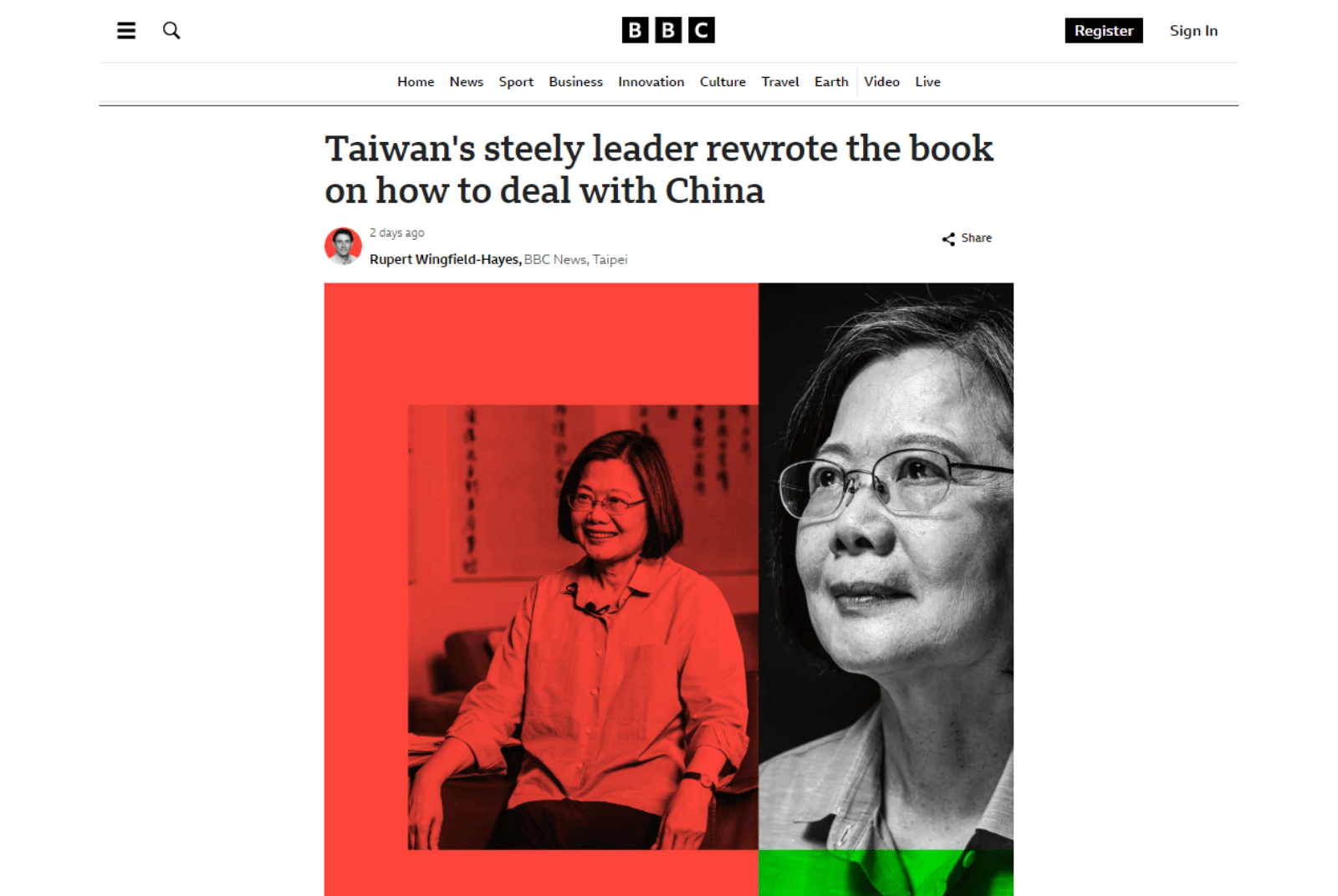 BBC安排記者親自前往蔡英文的官邸,撰寫人物專訪。文章的開頭,BBC記者首先描寫蔡英文溫和、喜愛動物的形象;接著,詳述她在任內如何制定外交與國防決策,包括加強與美國的友好關係、應對中國壓力,並保持堅定的立場。