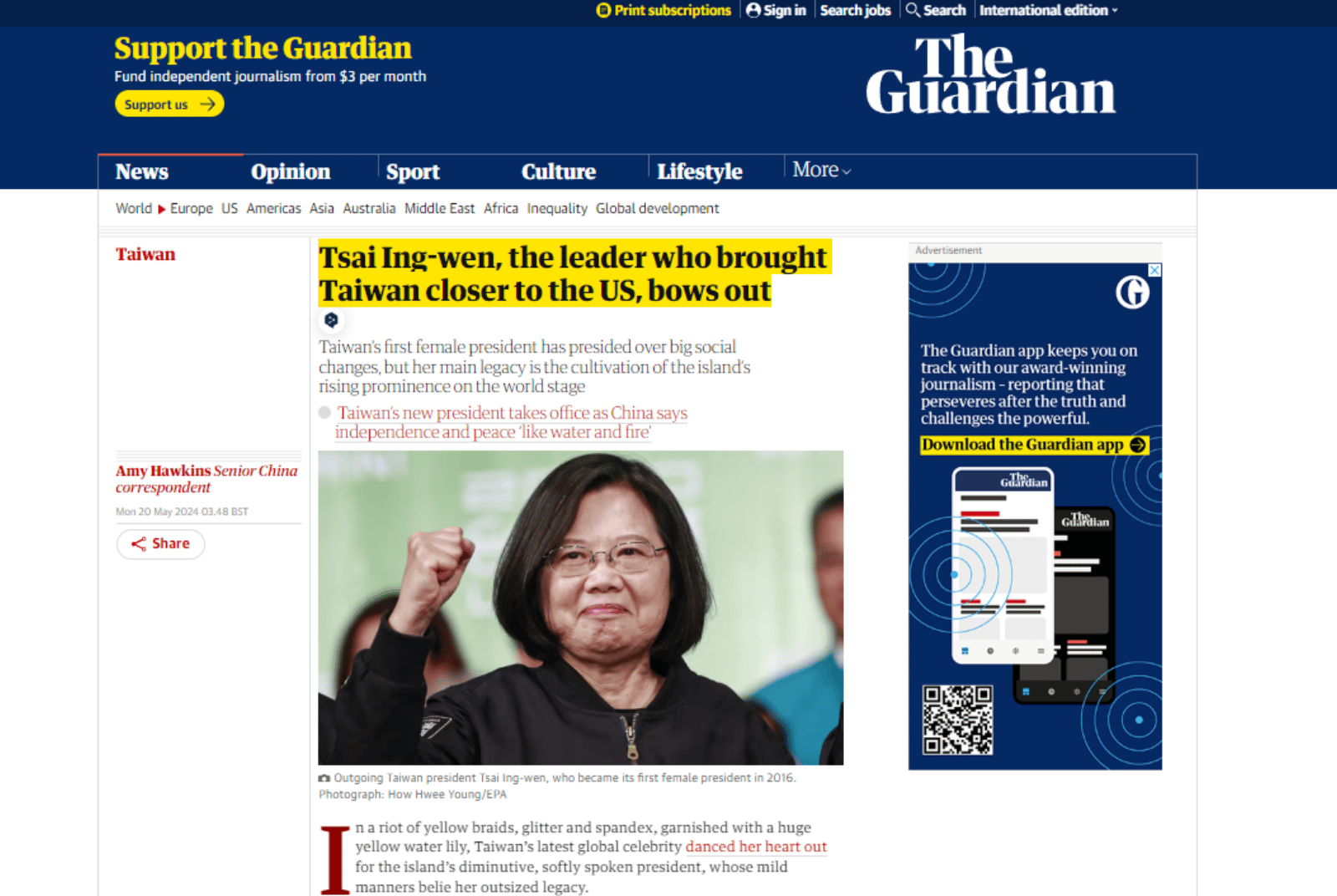 《衛報》在標題中強調,蔡英文在任內加強了台美之間的關係。文章則以變裝皇后妮妃雅在總統府的表演開頭,並形容蔡英文身形矮小、聲音柔和且謙遜;而她留下最重要的資產,則是「培育台灣在國際舞台上日益突出的地位,促進與美國的緊密關係。」