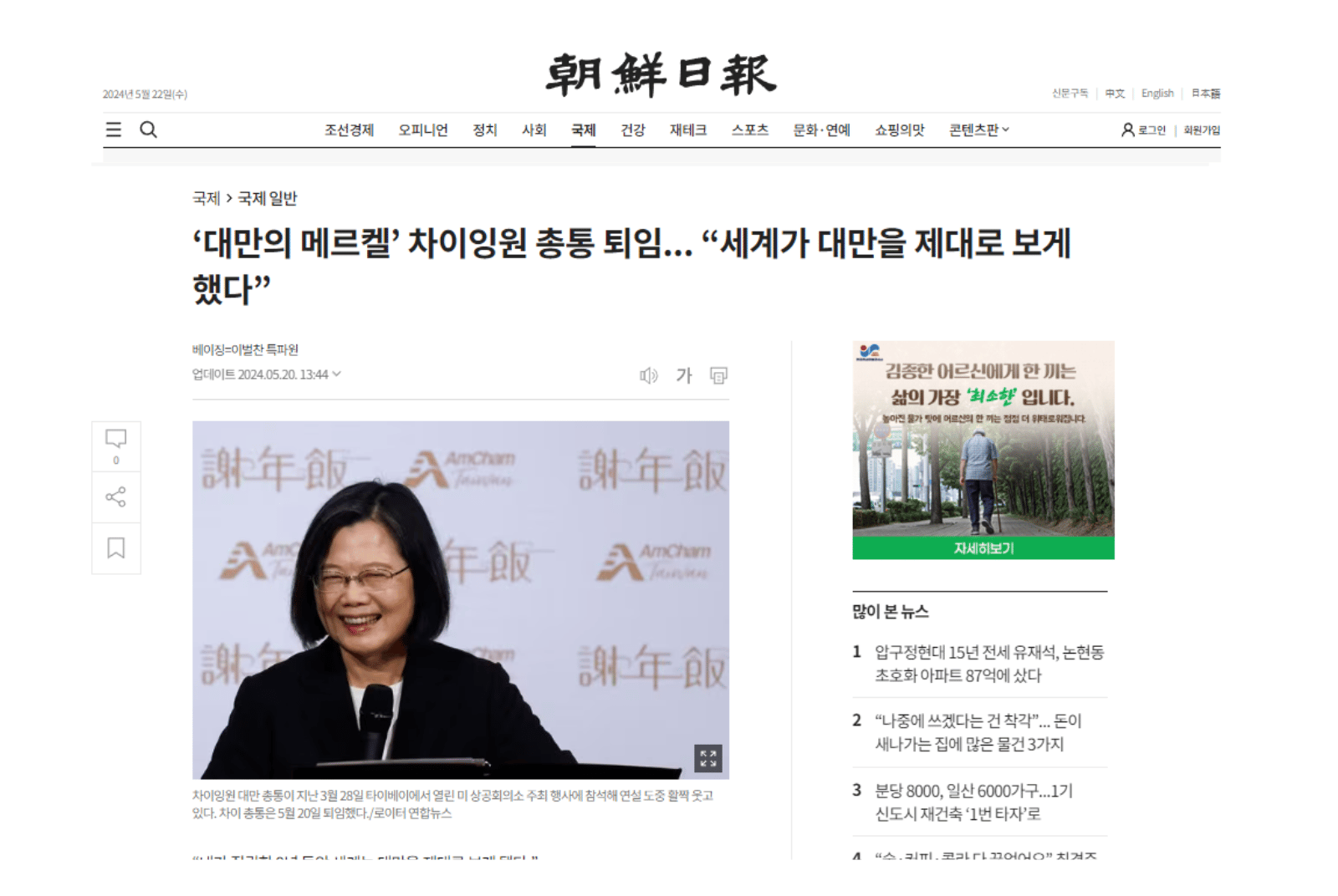 《朝鮮日報》共發布2篇相關報導,其中一篇的標題將蔡英文稱為「台灣梅克爾」,另一篇標題則是「改變台灣地位的『蔡英文八年』」(대만 위상 바꾼 ‘차이잉원 8년’)。