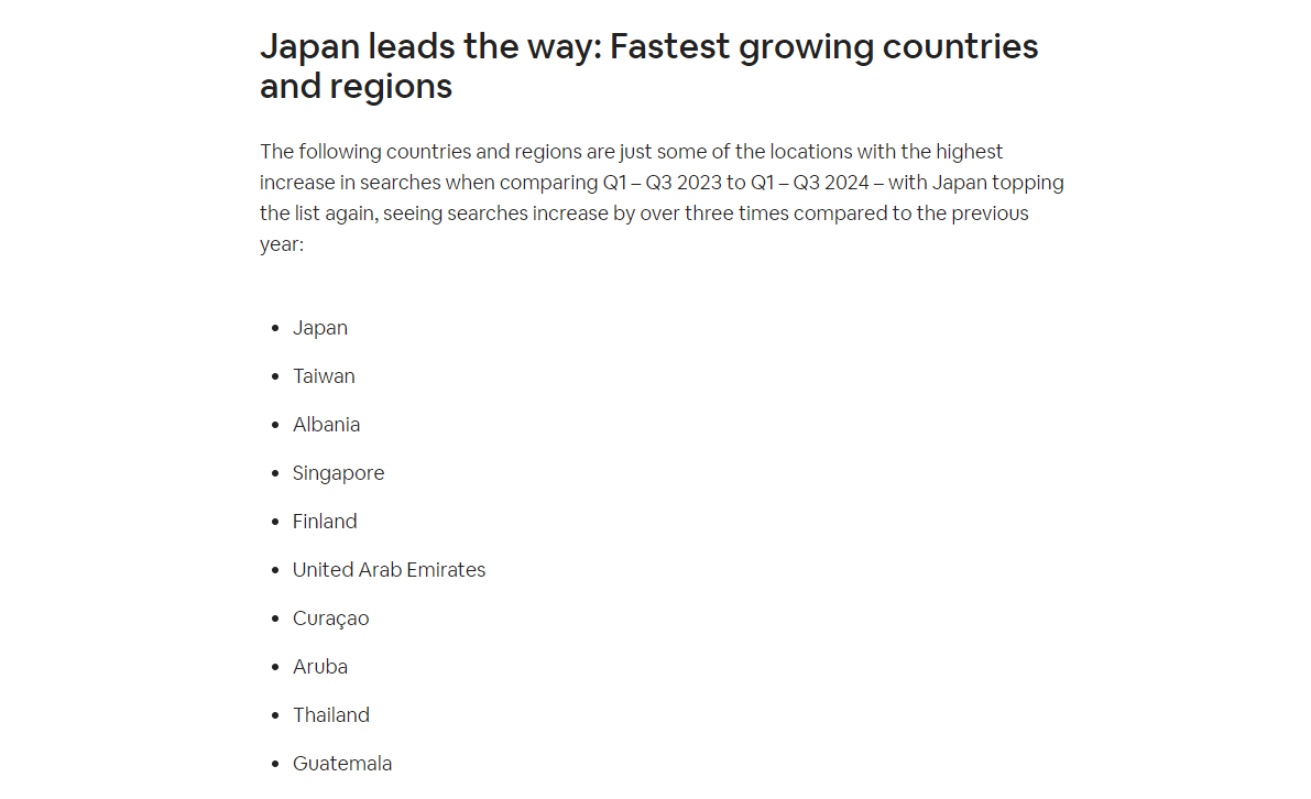 對於今年的旅遊熱潮,國際旅宿平台Airbnb日前發布的旅遊趨勢預測,2024年第一季至第三季與2023年同期相比,全球共有10個國家及地區在Airbnb上的搜尋次數大幅增加,榜首由日本奪下,台灣國際熱搜年增率登第二名,顯示今年旅遊熱度還在。