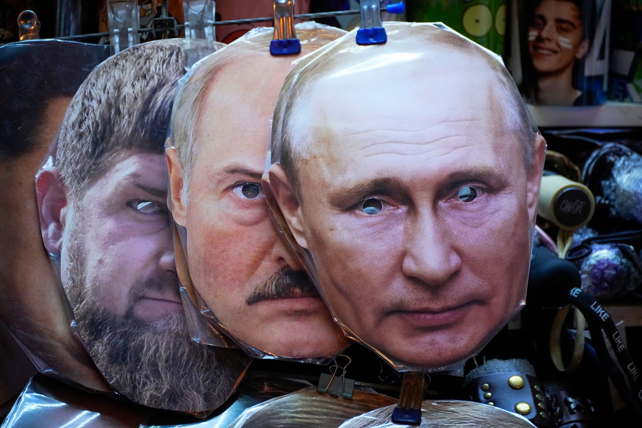俄羅斯聖彼得堡的一家商店販售了俄羅斯總統普丁Vladimir Putin(右)、白俄羅斯總統亞歷山大·盧卡申科 Alexander Lukashenko(中)和車臣地區領導人拉姆贊·卡德羅夫Ramzan Kadyrov(左)的面具。