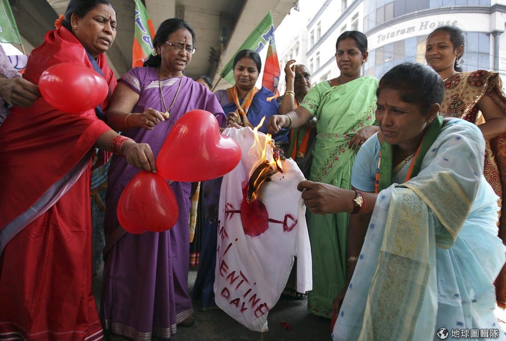 西方來的情人節與伊斯蘭教的價值衝突,在許多穆斯林心中是不合時宜的代表。照片中是2012年印度當地的「反情人節」活動,民眾燃燒有心型圖樣的衣服。
