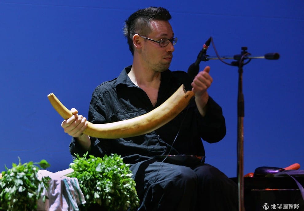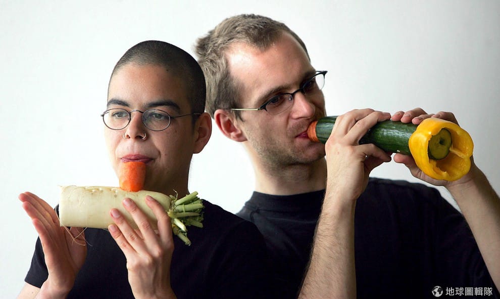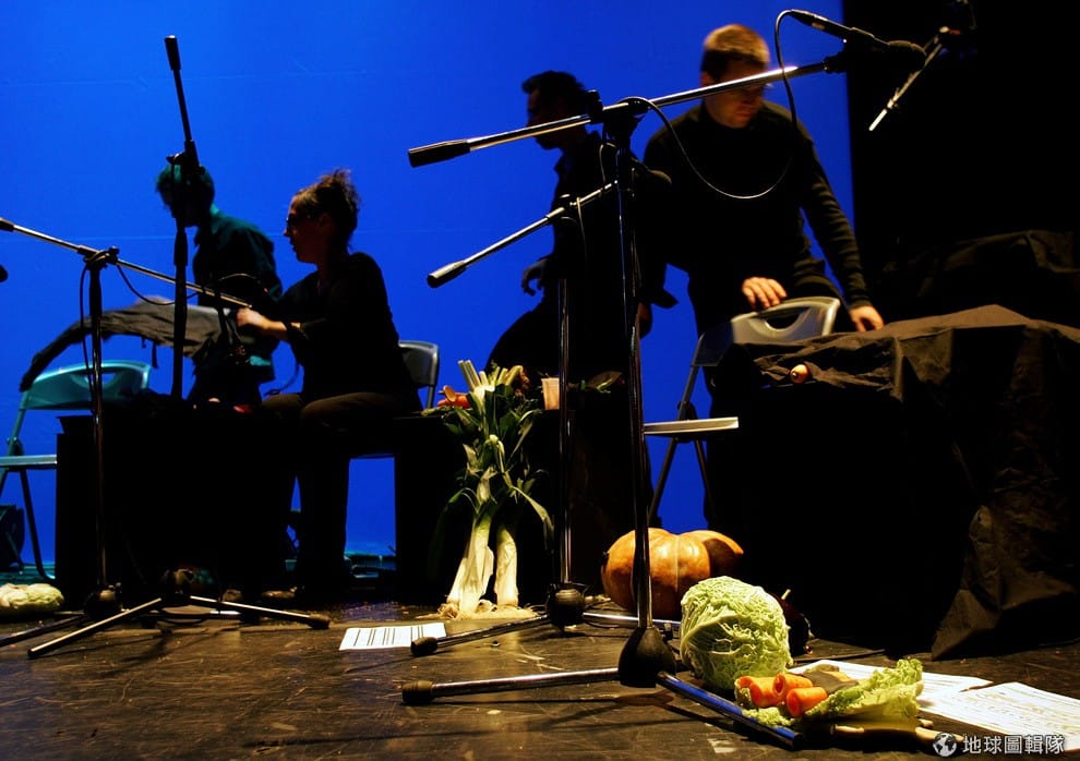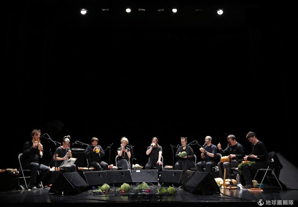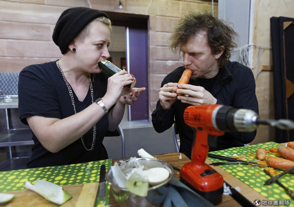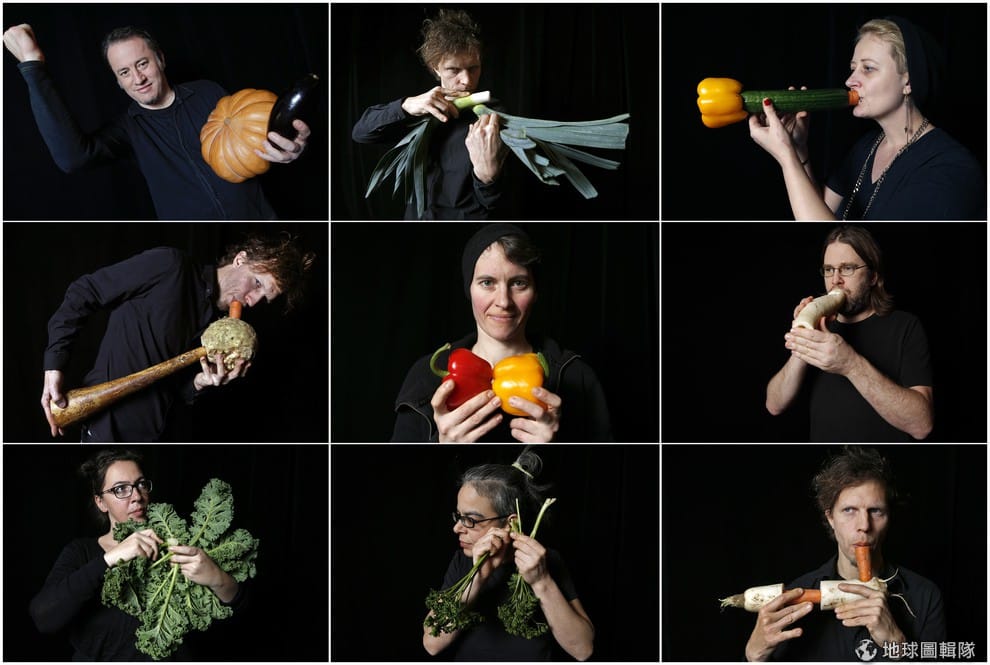 樂團成員威爾漢(左,Tamara Willhelm)、瑞特梅( Ernst Reitermaier)演奏蔬菜樂器。