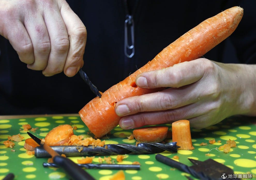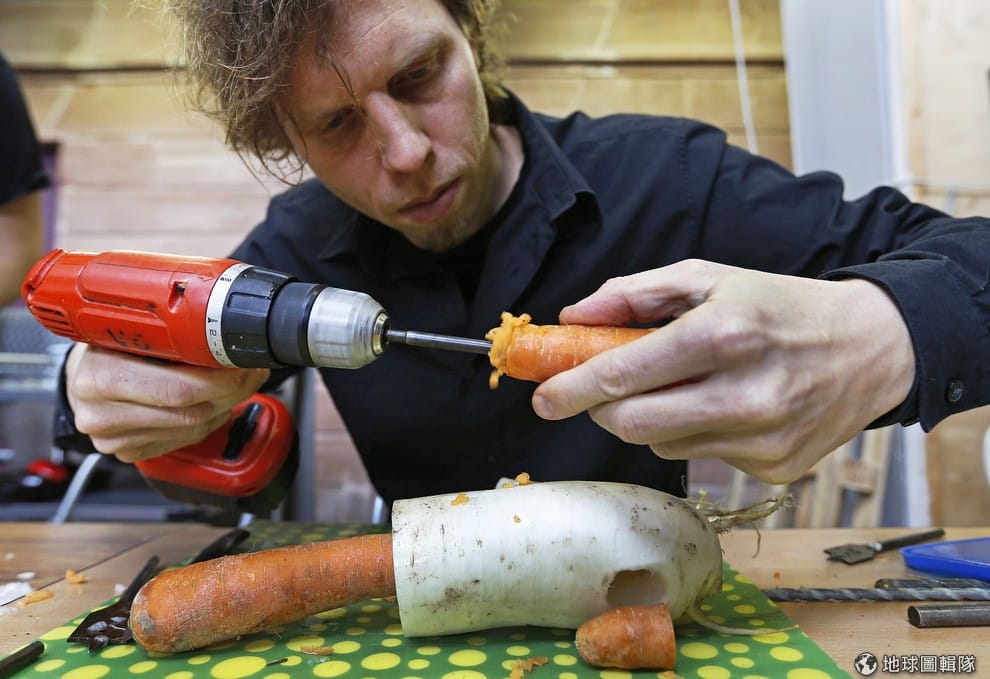 路透社樂團成員馬哈特正在用鑽子製作蘿蔔樂器。