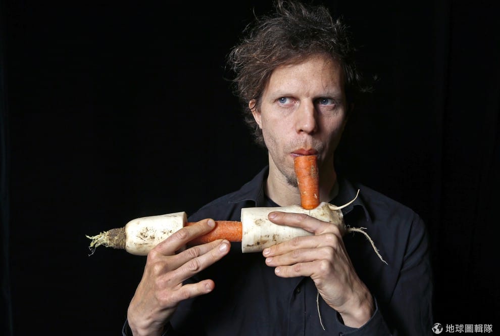 路透社樂團成員薇可拉(左,Martina Winkler)、馬哈特吹奏蔬菜樂器。