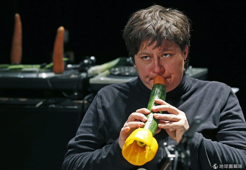路透社樂團成員施洛其(Ingrid Schlogl)在音樂會上吹奏蔬菜樂器。