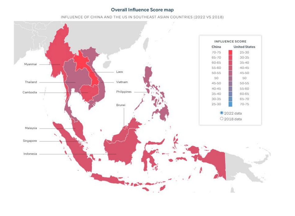 報告指出,中國2022年對東南亞整體的經濟影響力達70分,而美國只有30分,且中國與東協所有國家的經濟關係都優於美國。中國對東南亞的外交影響力也力壓華府,在東協10國的外交影響力達63分,美國僅37分,且在東協每個國家的得分都低於中國。美國只在國防影響力以72分贏過中國的28分,文化影響力美國52分,中國48分,算是旗鼓相當。