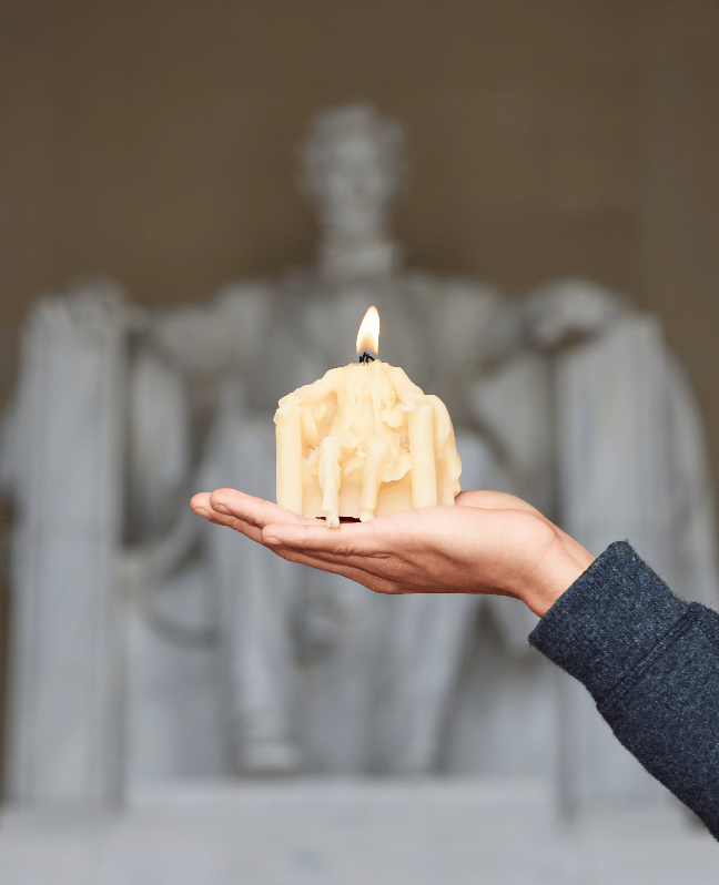 而在這尊林肯蠟像身上,遍布了許多燭芯。一旁的告示牌說明,前來參觀的民眾可以先仔細閱讀雕像背後的故事,再點燃燭芯,接著在1到2分鐘後將火焰吹熄。隨著前來參觀的人越來越多,林肯蠟像的外觀也會逐漸改變。