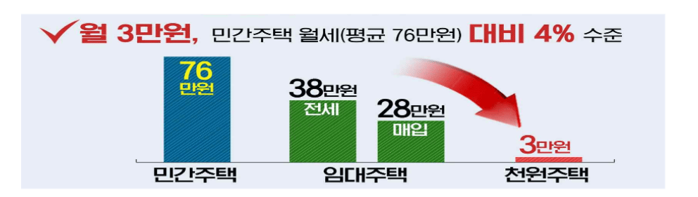 平均月租76萬韓元的地區,使用千元住宅方案,每月只需花3萬韓元(即原來月租的4%),即可入住市府提供的公共住宅。