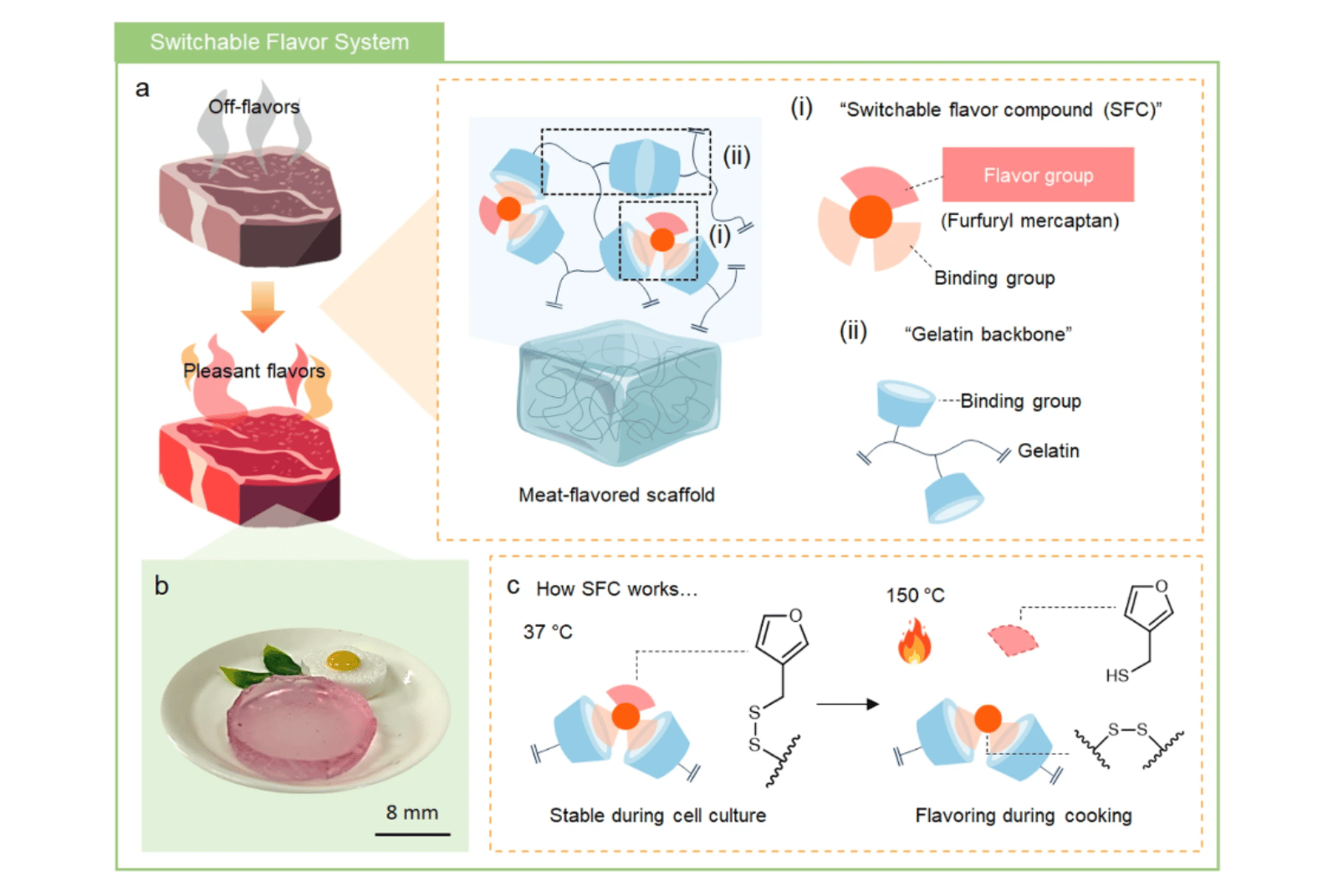 研究團隊透過模仿梅納反應中的風味,來複製普通肉類的味道。他們將特殊的風味化合物加入明膠為主的水凝膠中,打造了一個功能性支架。當加熱到攝氏150度時,這種化合物會「啟動」並釋放肉味,模擬梅納反應。