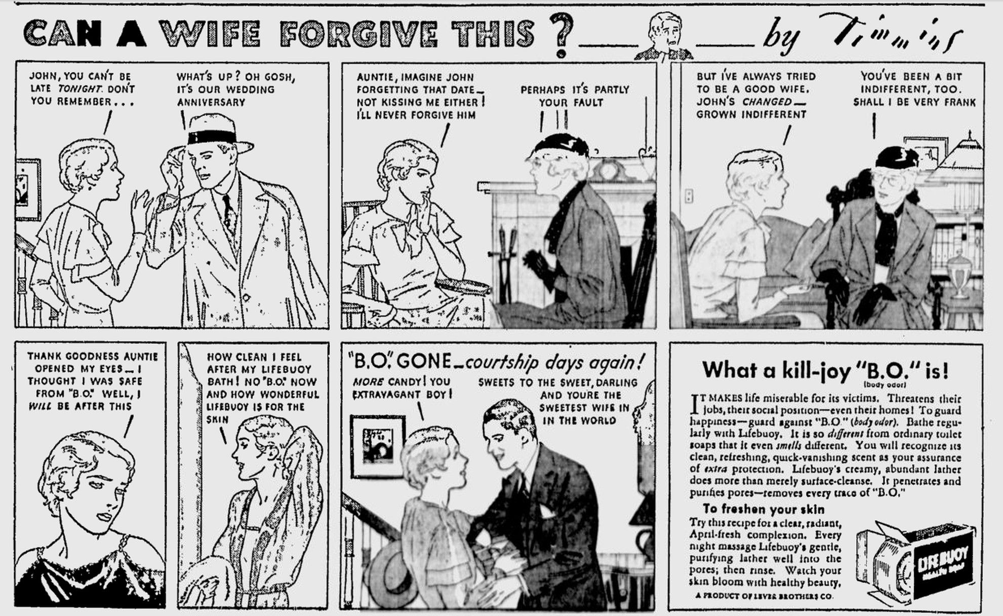 圖為英國肥皂公司Lifebuy於1993年推出的香皂廣告,以連環漫畫的形式,提醒女性「不好的體味,會威脅到她們的工作、社會地位,甚至她們的家!」