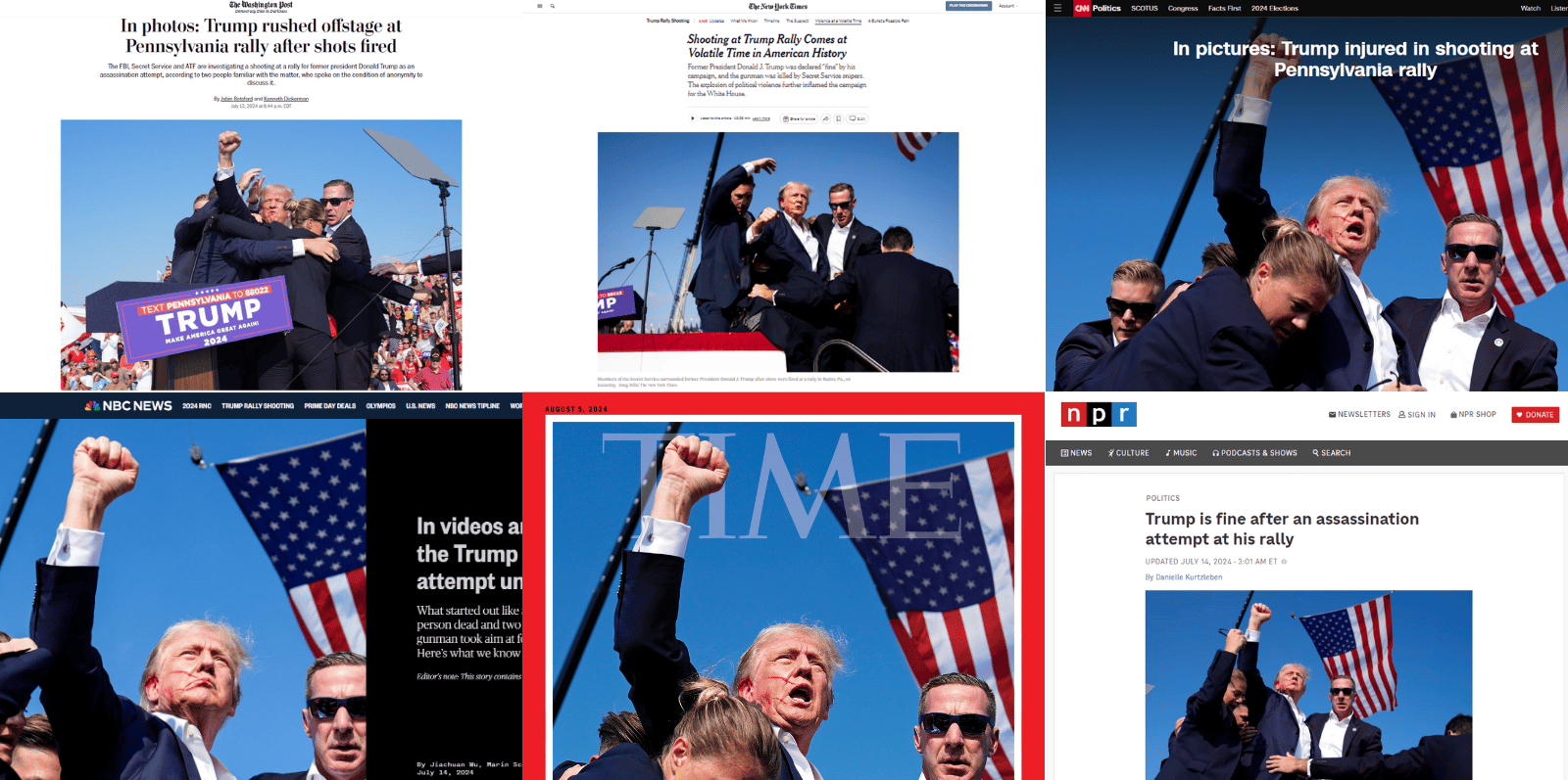 不同媒體在報導川普遭槍擊後高舉起手的畫面時,採用的照片、角度都不盡相同。