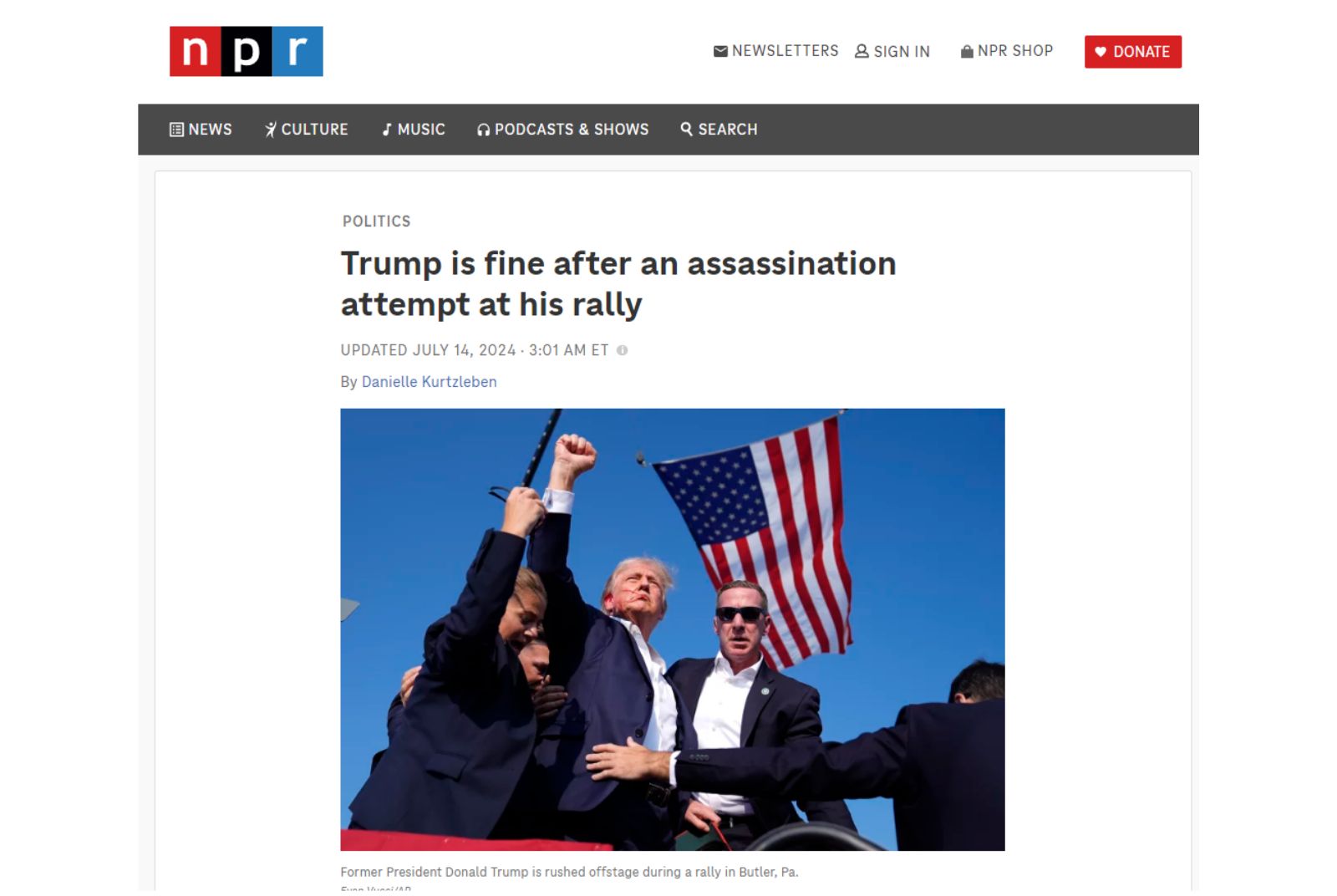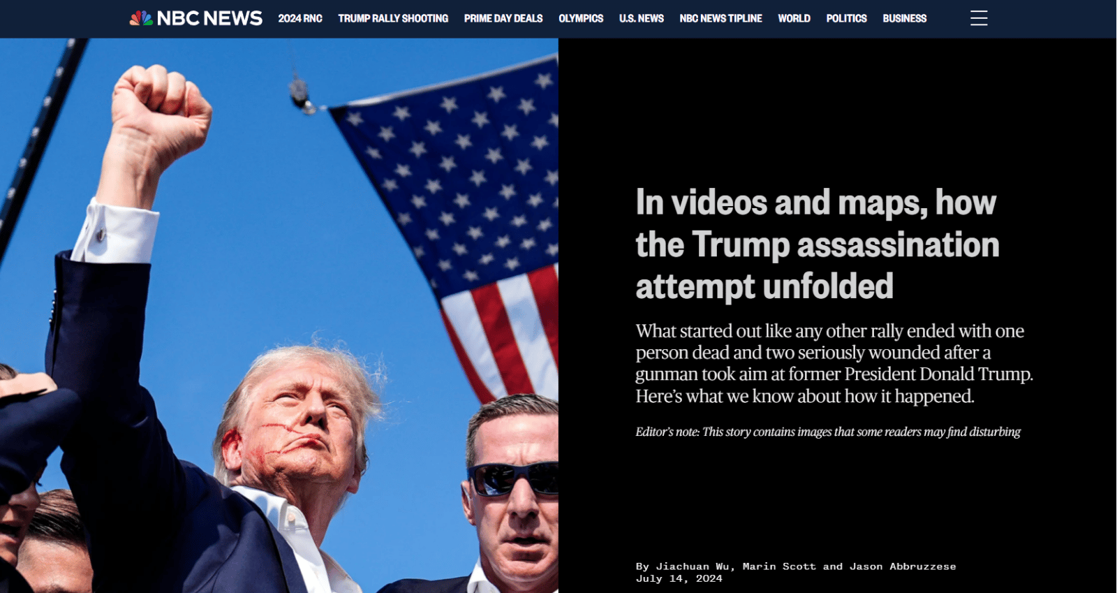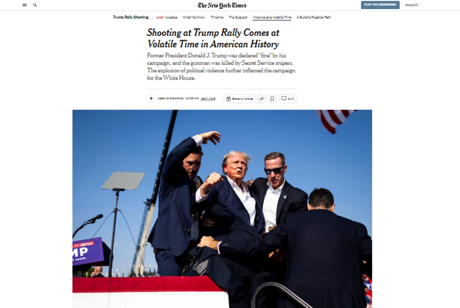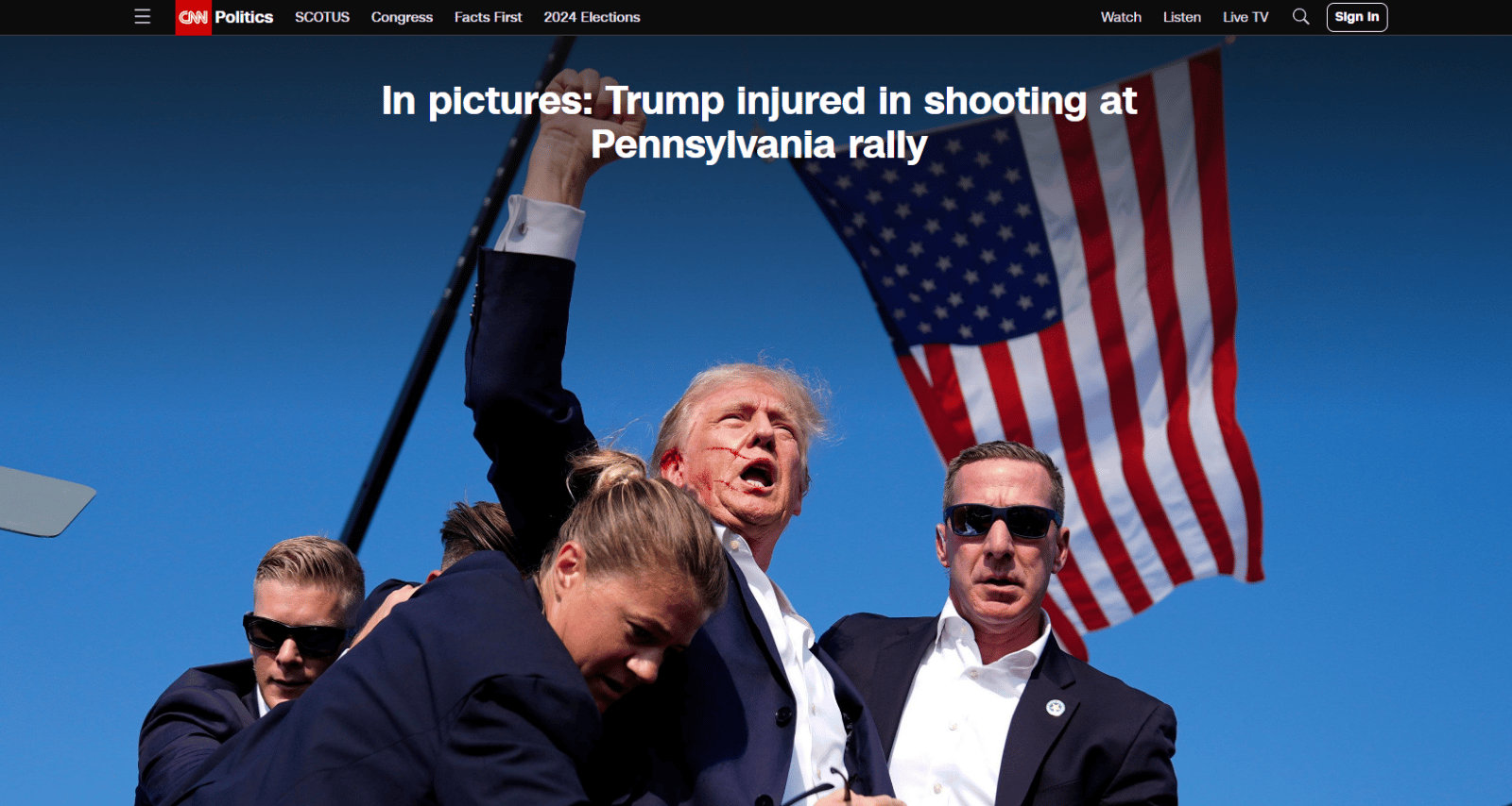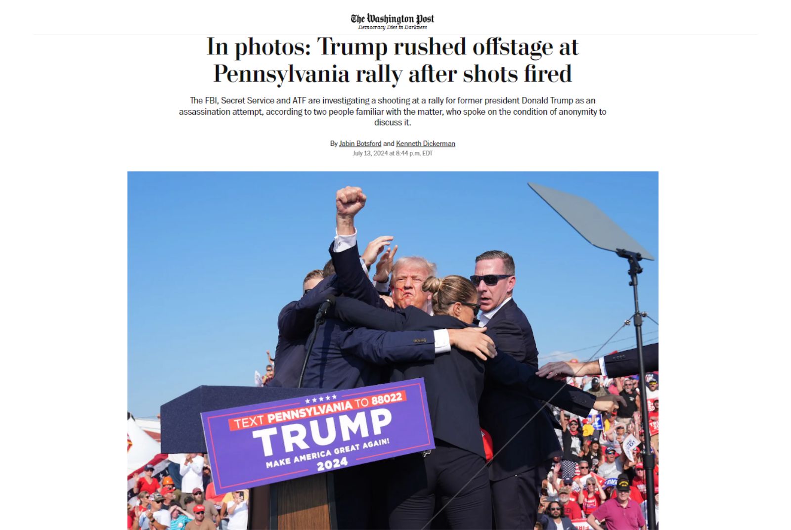 雖然特工們奮力想阻止川普被發現,當川普站起身時,特工仍試圖掩護他;不過,川普卻「奮力走向最前線」,特工護送他前往車內的路上,他突然叫大家等等,摸了摸自己的頭髮,伸出右手穿過特工的屏障,舉起拳頭,向民眾說:「戰鬥吧!」。