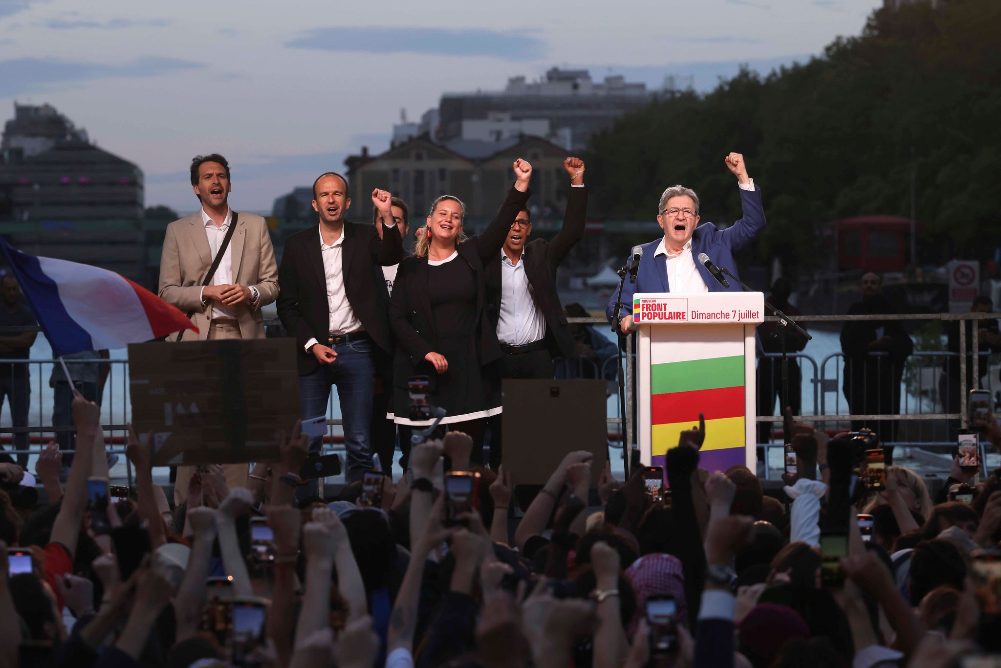 7月7日晚間,法國左翼聯盟新人民陣線(NFP,Nouveau Front Populaire)中,政黨不屈法國(France insoumise)的創始人梅朗雄(Jean-Luc Melenchon),與其他黨員一同向著群眾高喊。
