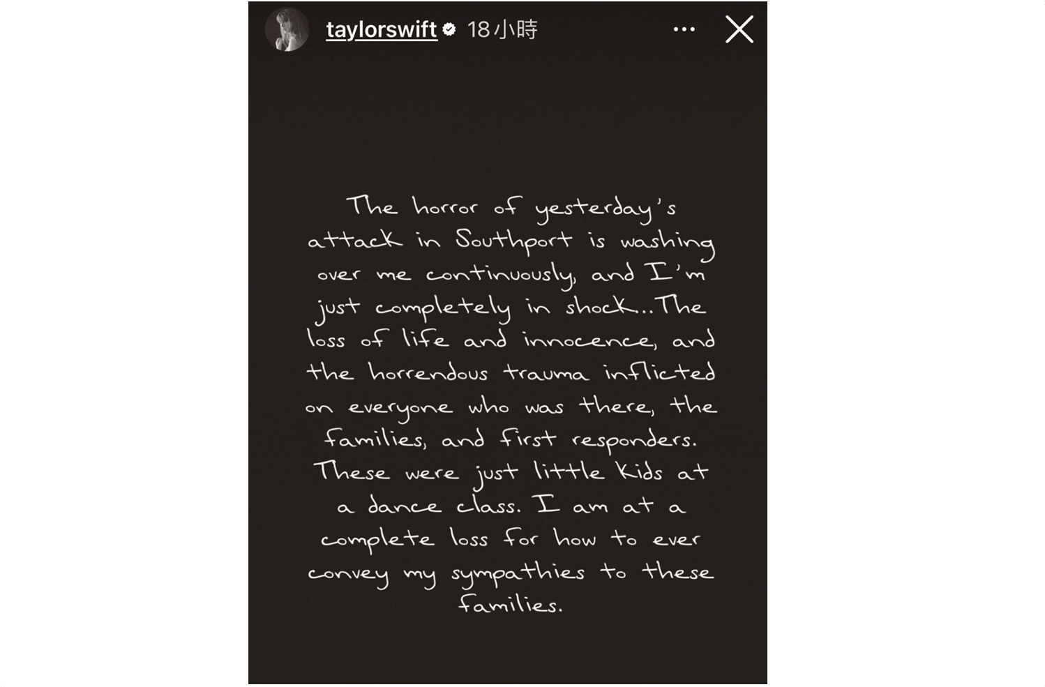 泰勒絲也在社群平台發布哀悼這起恐怖事件,「紹斯波特攻擊事件的恐怖感不斷襲來,令我感到非常震驚。許多無辜且純真的生命逝去,在場所有人、家庭、第一線救援人員心中也都形成了可怕的創傷。他們都只是在舞蹈課上課的孩子。我完全不知道該如何向這些家庭,表達我內心的哀悼之情。」