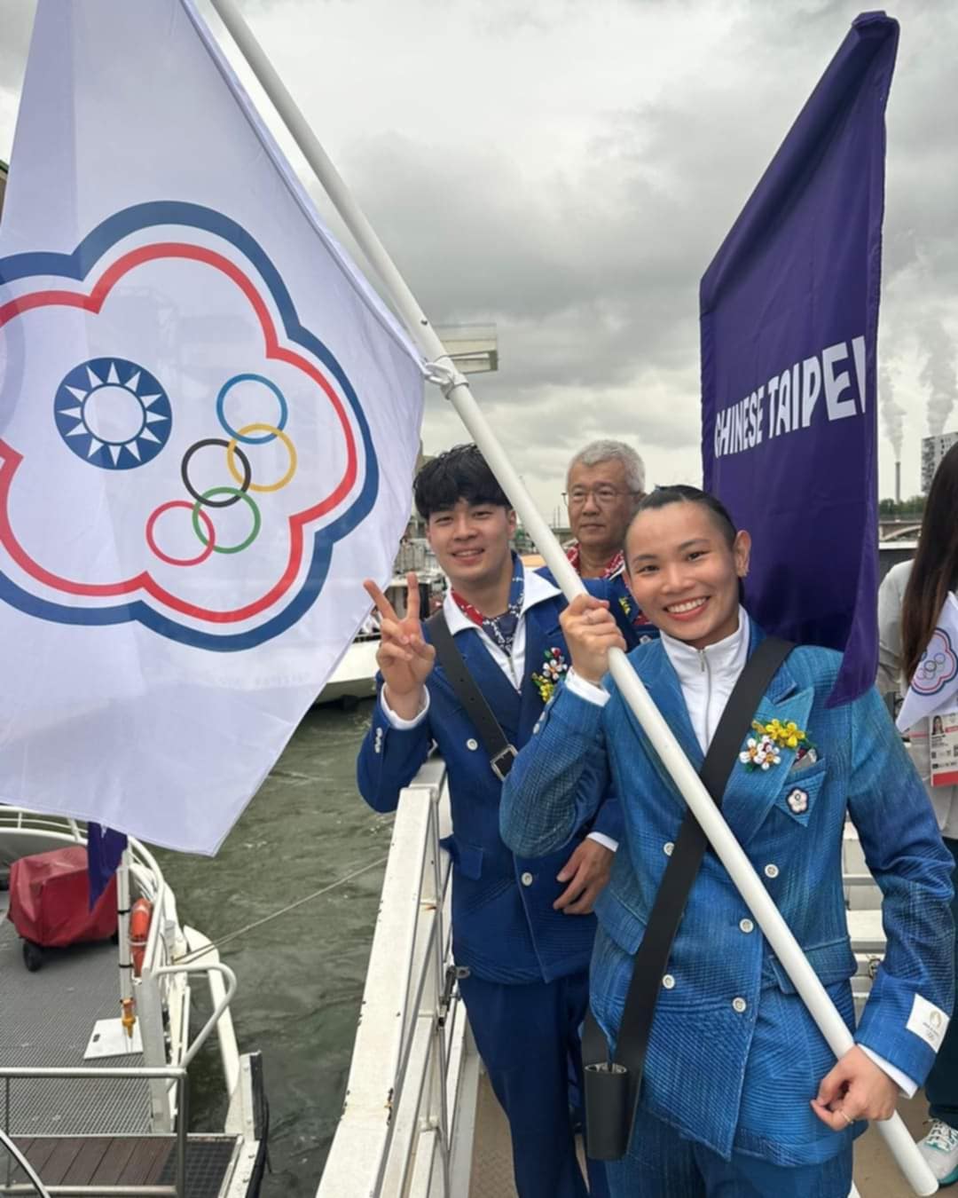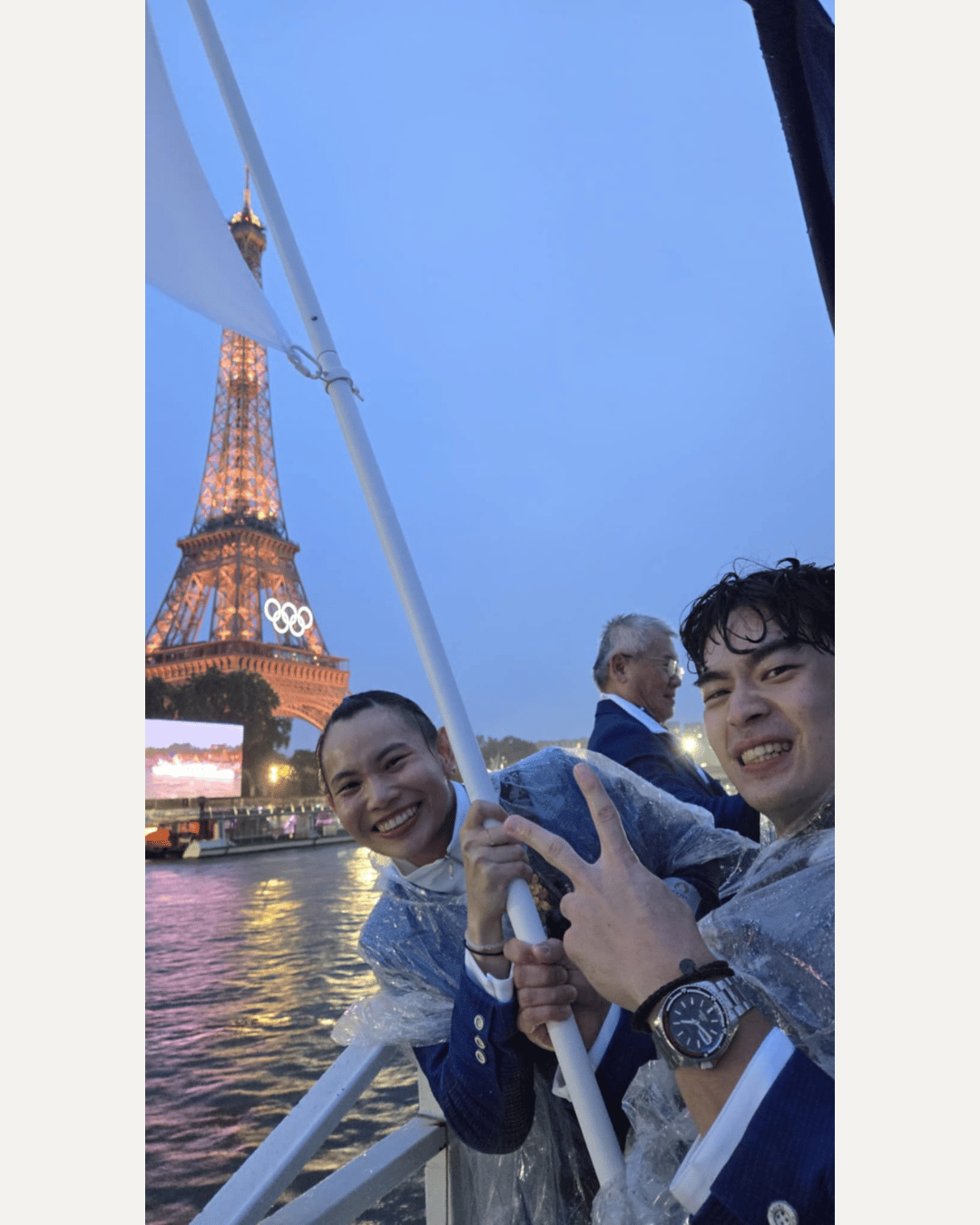 在巴黎奧運的開幕式中,孫振與蘇志鵬教練身穿中華隊的進場制服,一起留下珍貴的合照。圖片來源:蘇志鵬教練提供