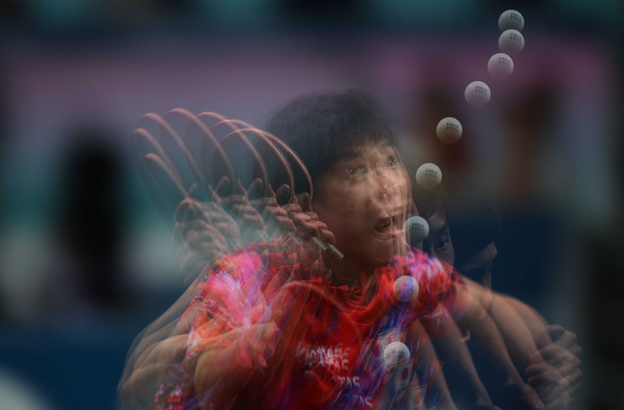 路透社 / 達志影像null日本桌球選手張本智和,於桌球男子團體半決賽中的發球瞬間。