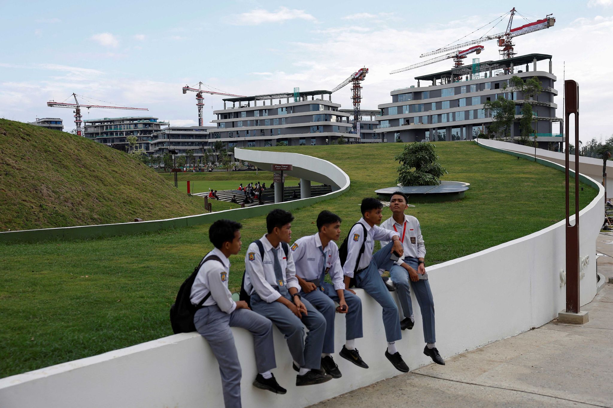 獨立日當天,努山塔拉一群學生坐在公園裡,旁邊是仍在興建中的大樓。