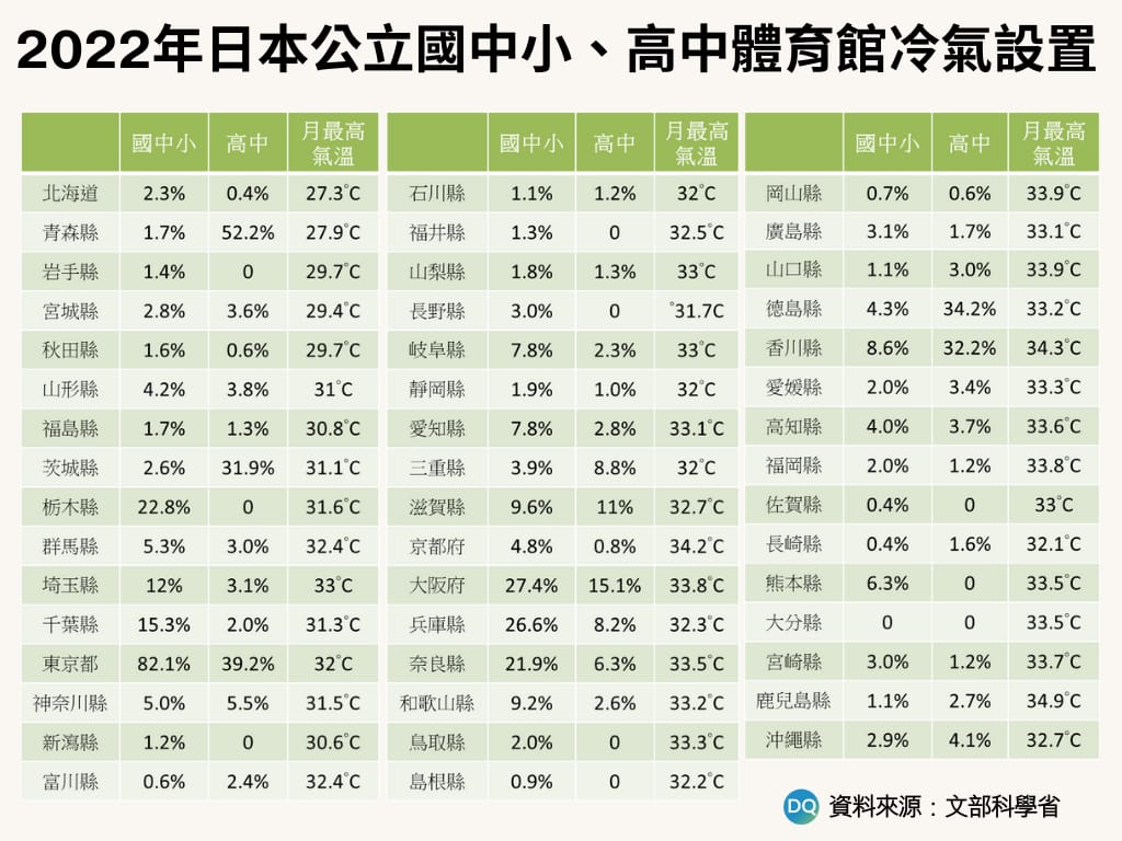 根據文部科學省2022年「公立國中小學、高中體育館冷氣設置狀況」數據統計,全國小學和國中體育館中的冷氣設置率僅為11.9%。按都道府縣劃分,東京都的設置率達到82.1%,明顯高於其他地區,而設置率超過20%的只有大阪府、兵庫縣、栃木縣、奈良縣等5個府縣,絕大多數地區的設置率僅為個位數,甚至是0。