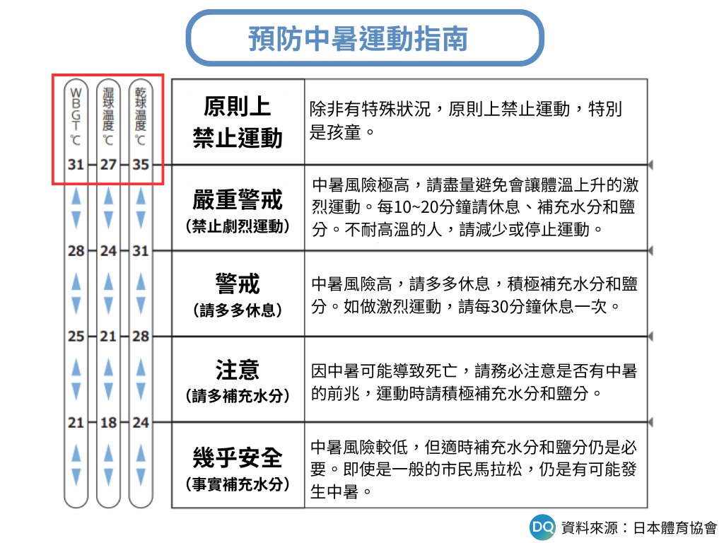 2019年,日本體育協會最新版的「預防中暑運動指南」(熱中症予防運動指針),將綜合溫度熱指數(WBGT)列入校園體育活動的標準,如果WGBT數值超過31度℃,「原則上」應禁止所有運動,特別是孩童。