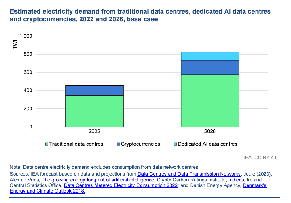 美國新聞網站Vox一篇分析指出,國際能源總署(IEA)1月發布今後兩年全球能源使用預測,首度納入資料中心、加密貨幣和AI相關領域的電力消耗評估。IEA估計,截至2022年,這三類領域的用電量加總占全球能源需求近2%;然而到2026年,需求量會翻倍,相當於日本全國一年的用電量。