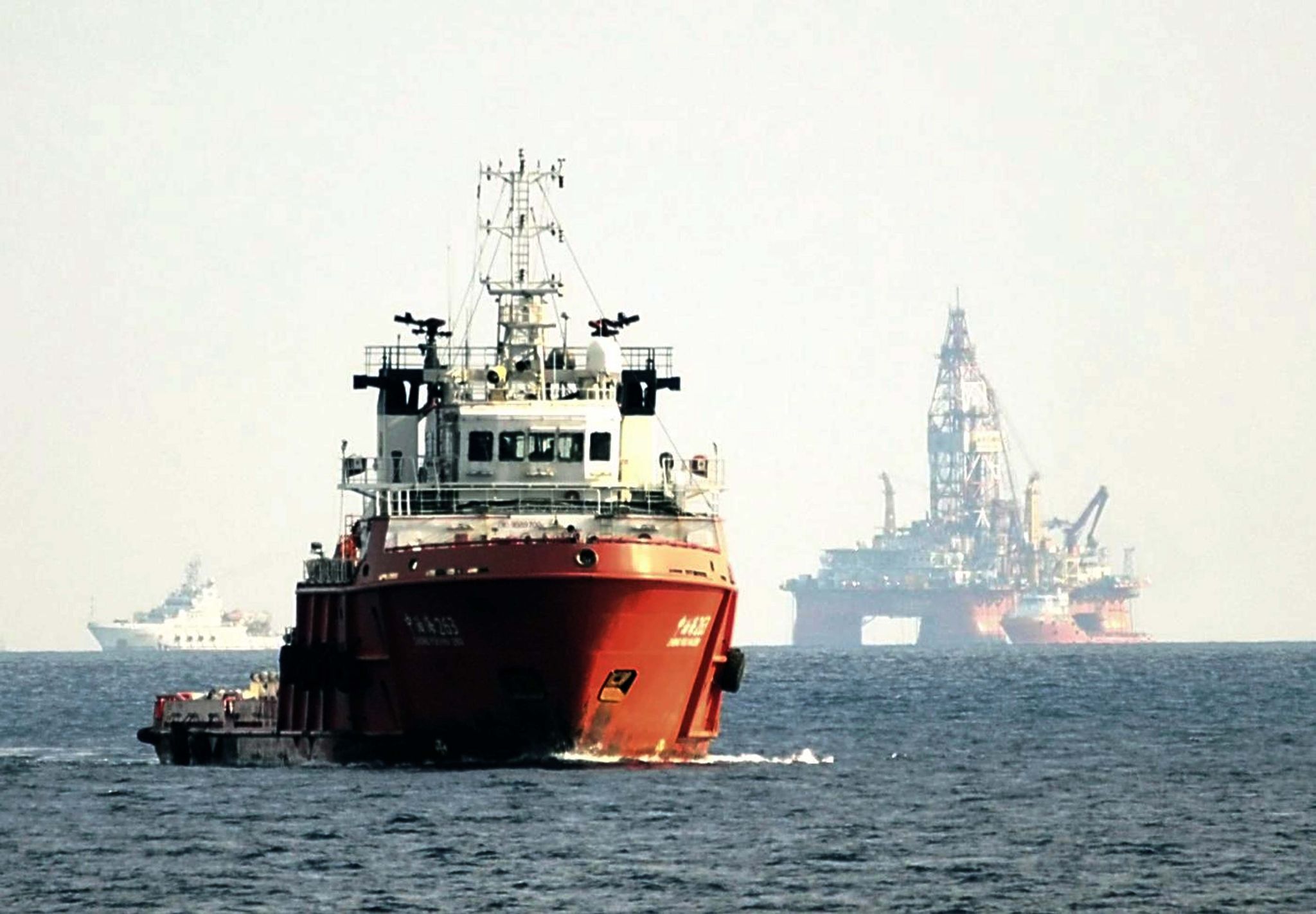 南海上一座中國的鑽油平台附近,中國船隻與越南的海警巡邏船正緊張對峙。