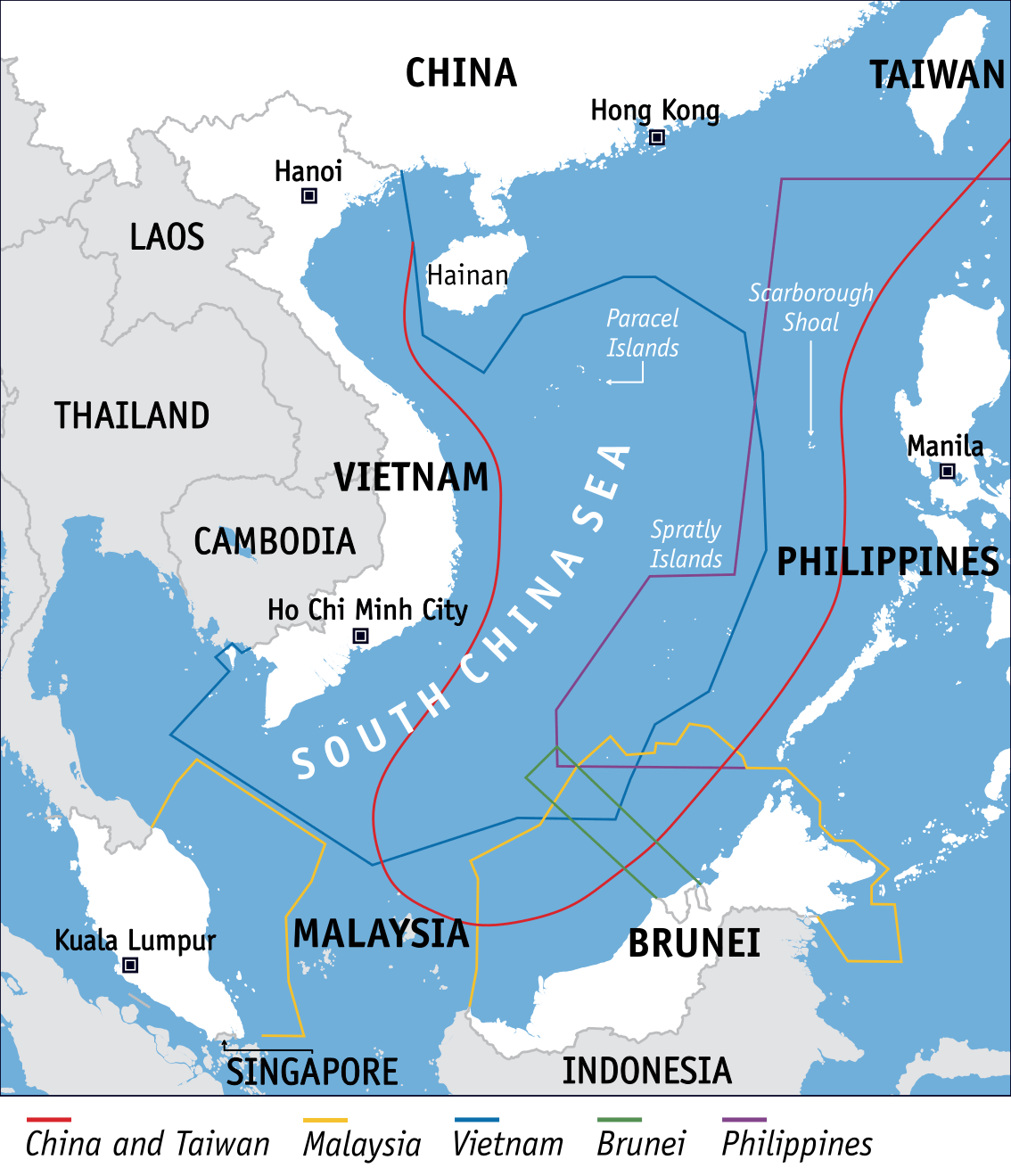 各個國家於南海主張的主權範圍。