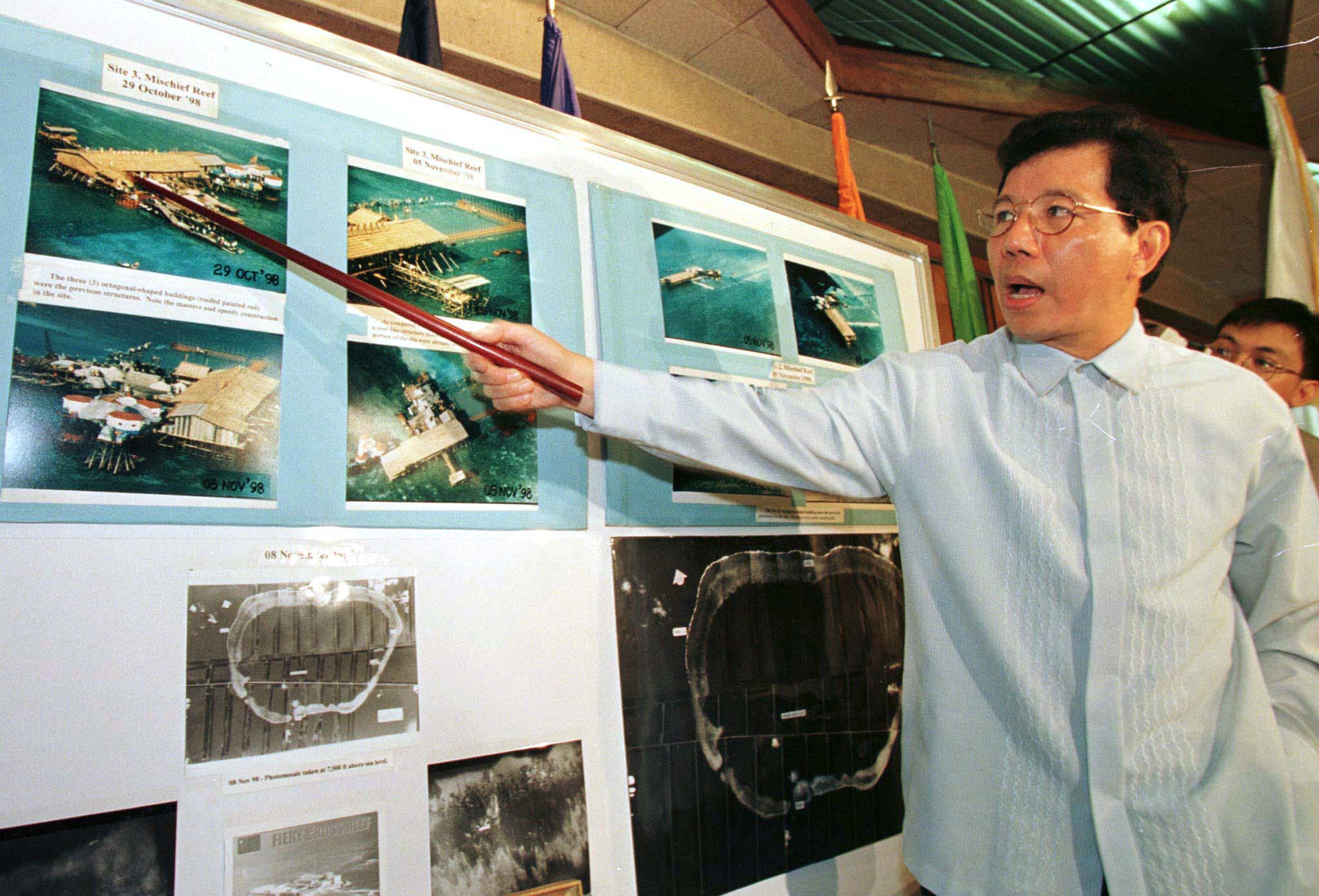 1998年,時任菲律賓的國防部長正展示一系列於南沙群島拍攝的照片,查看中國在這些島嶼上建造的新設施。