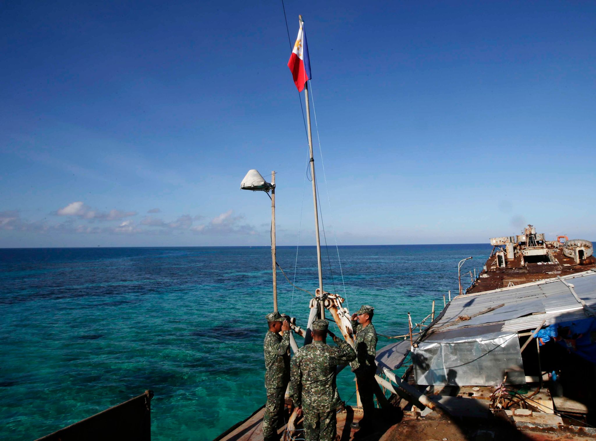 2014年,菲律賓軍隊於南沙群島中的仁愛暗沙附近升起國旗。