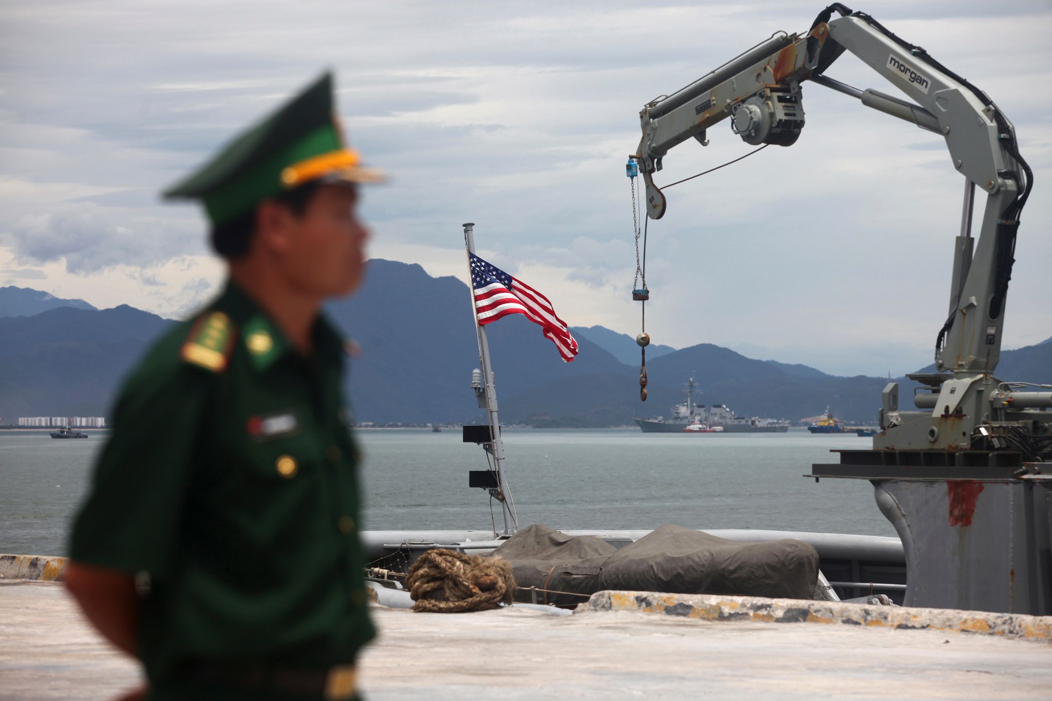 一艘美國海軍的船隻停泊於越南的港口。