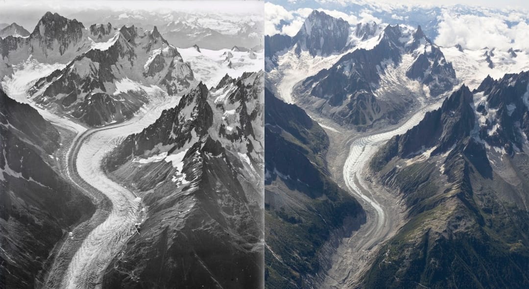 1919年(左)和2019年(右),阿爾卑斯山最高峰白朗峰(Mont Blanc)上的冰川空拍比較。
