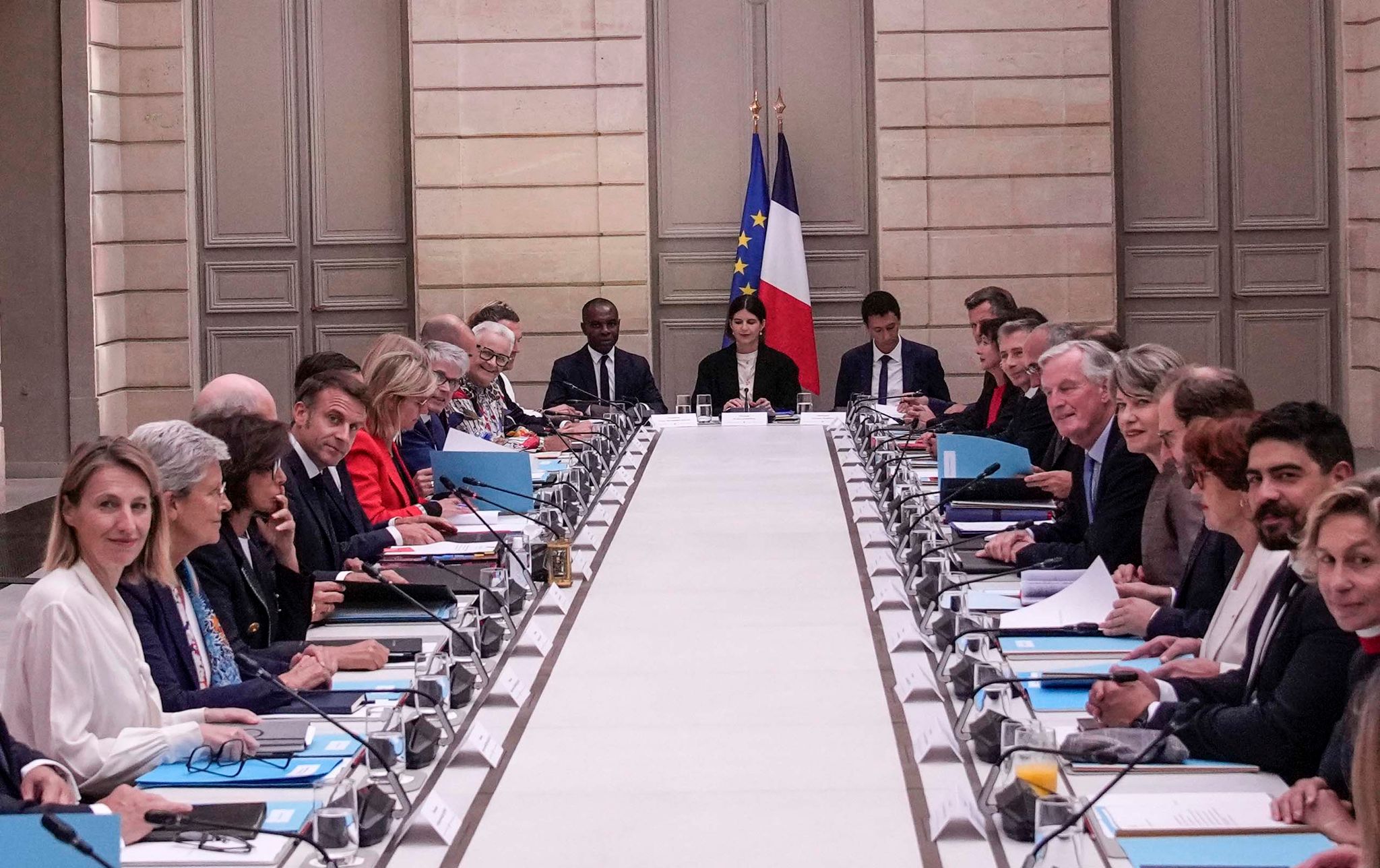 9月23日,巴尼耶組成的新政府,在愛麗舍宮與馬克宏進行會議。左排中間為馬克宏,右排中間則是新總理巴尼耶。